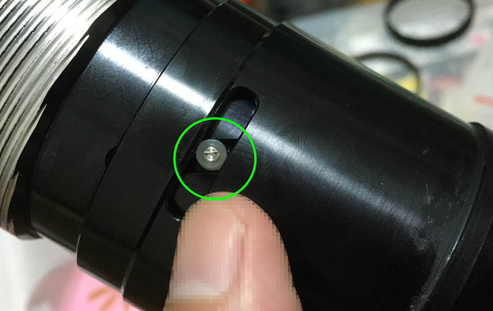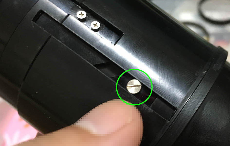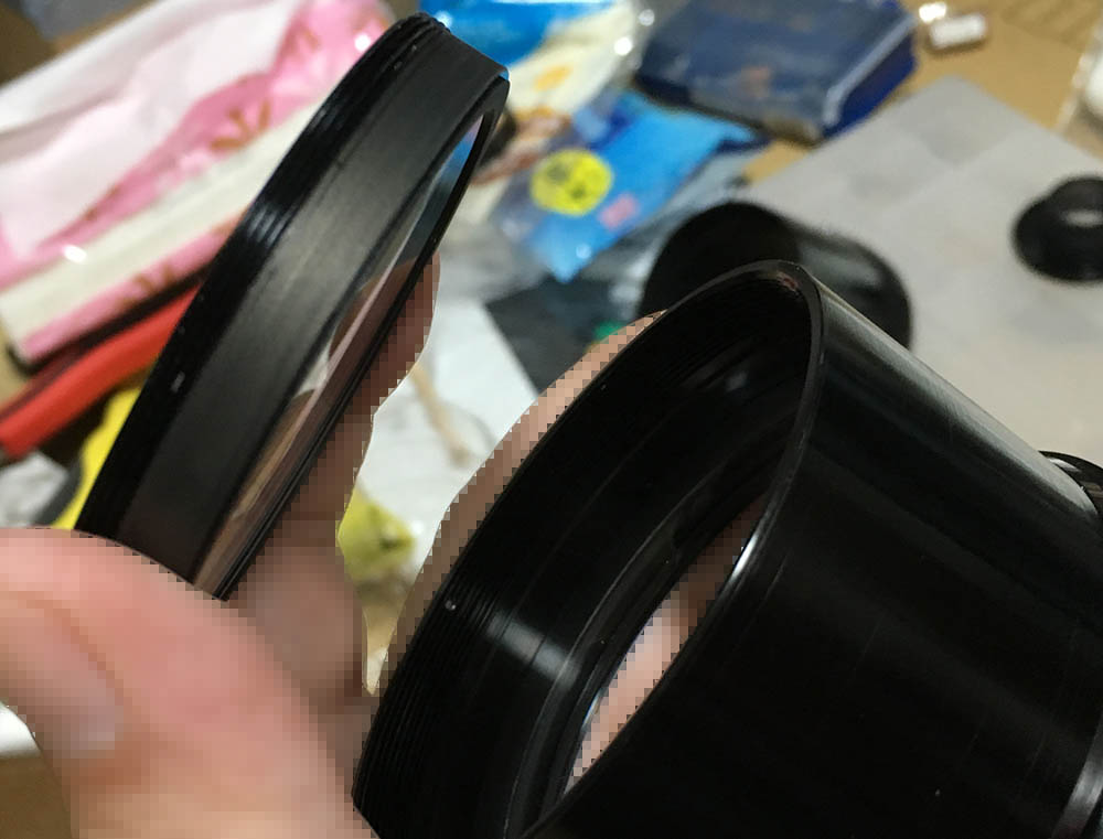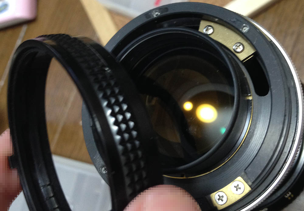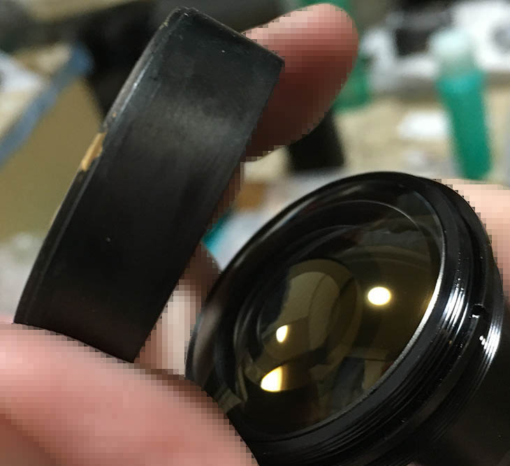The optics inside the barrel is exposed, be careful not to damage it. This thing moves in-and-out, don’t jam it by accident. Dismantle this with a rubber cup to remove the front ring then remove the whole thing with a lens spanner. Never flood this part with alcohol or solvents.