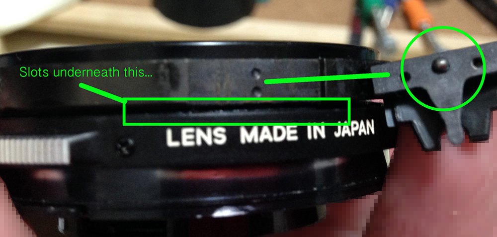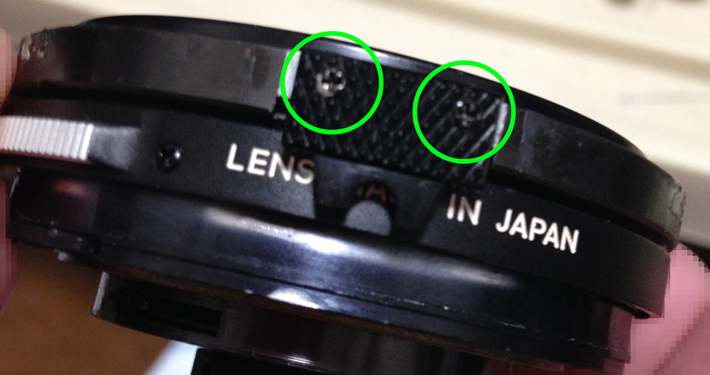 Remove the focusing ring by extracting its screws, I circled the parts where the screws used to be in. While removing this, be careful with the aperture coupling switch. See the next 3 picture to understand why.