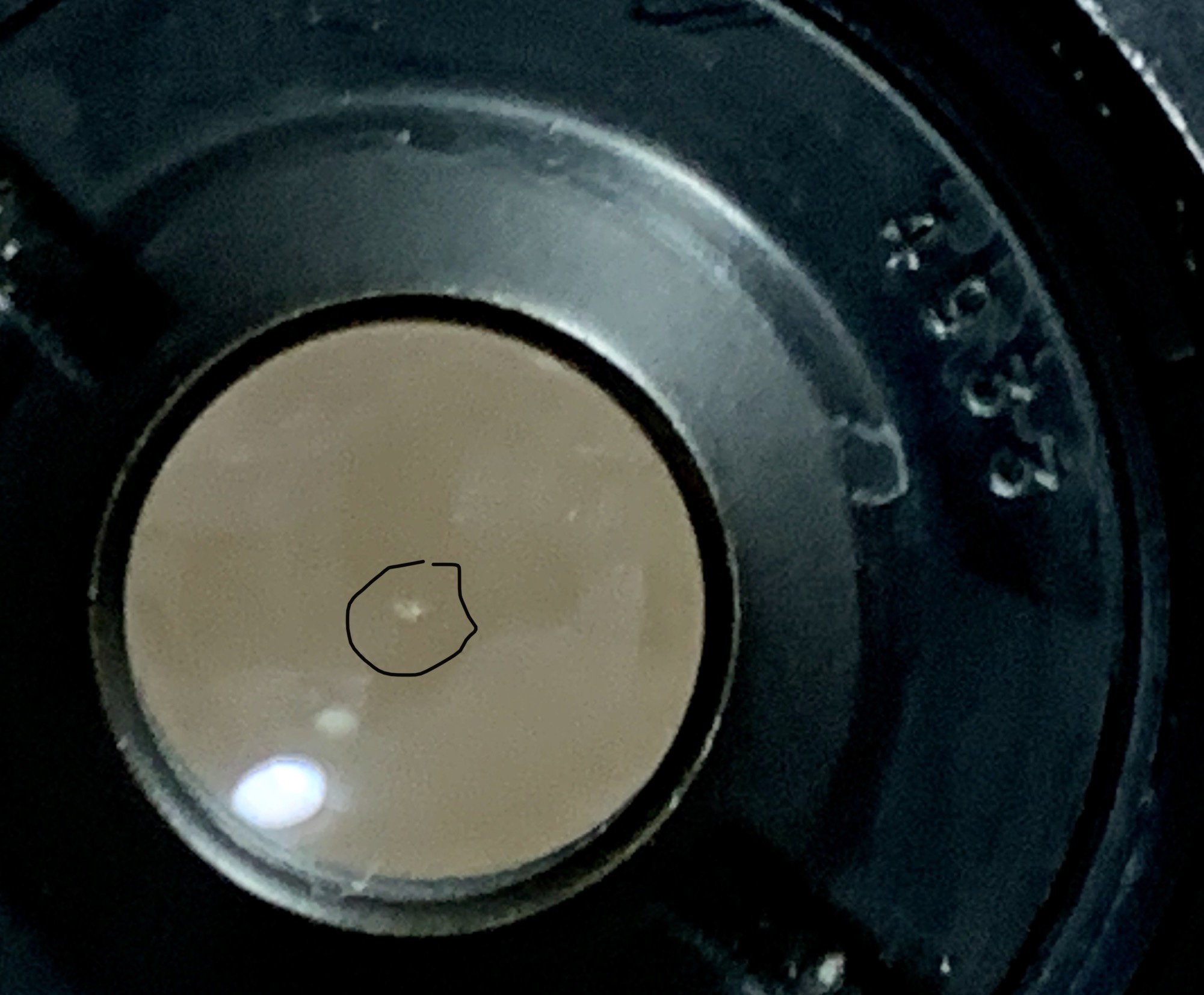 It looks like dirt in the sensor but this is actually caused by a deep chip in the front element. While it won’t be visible in normal cases, shooting an even-colored object or scene with the iris stopped-down will cause it to show.