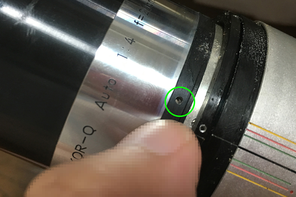 Unscrew this long screw from the aperture ring. This screw serves as a pin to couple the aperture ring to the aperture fork so you can control the iris.