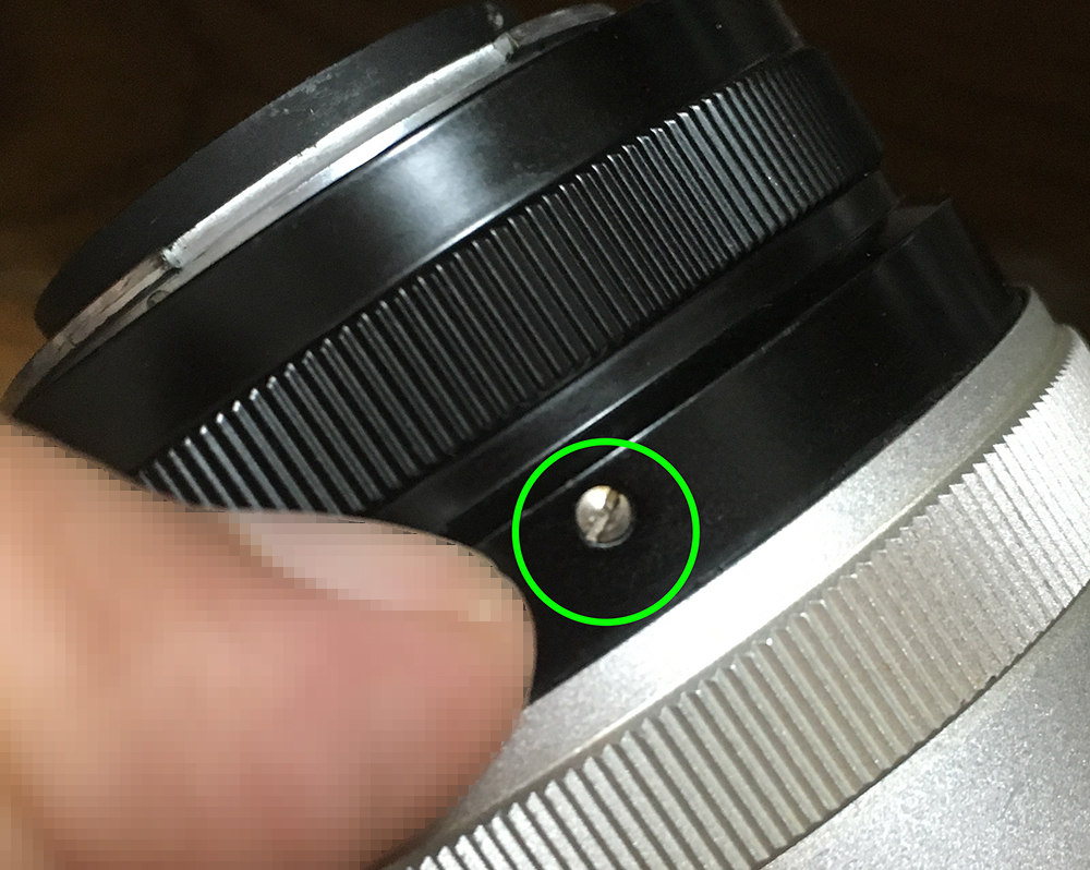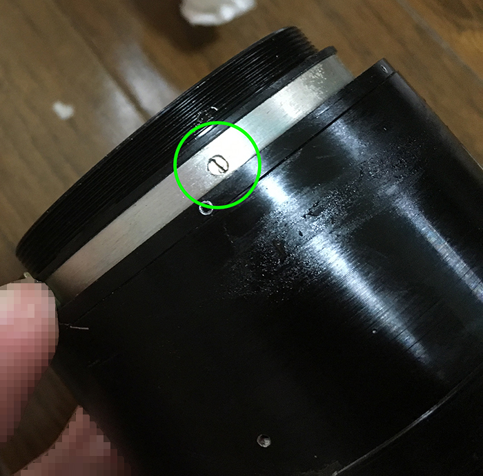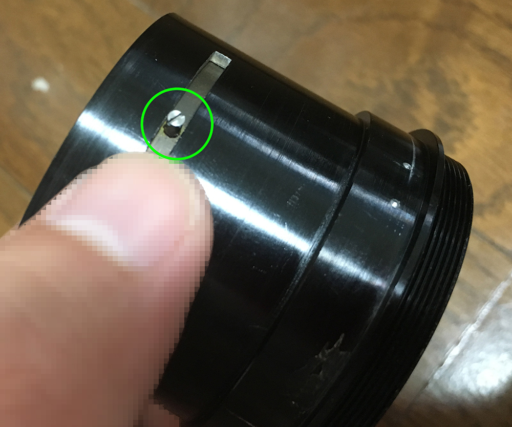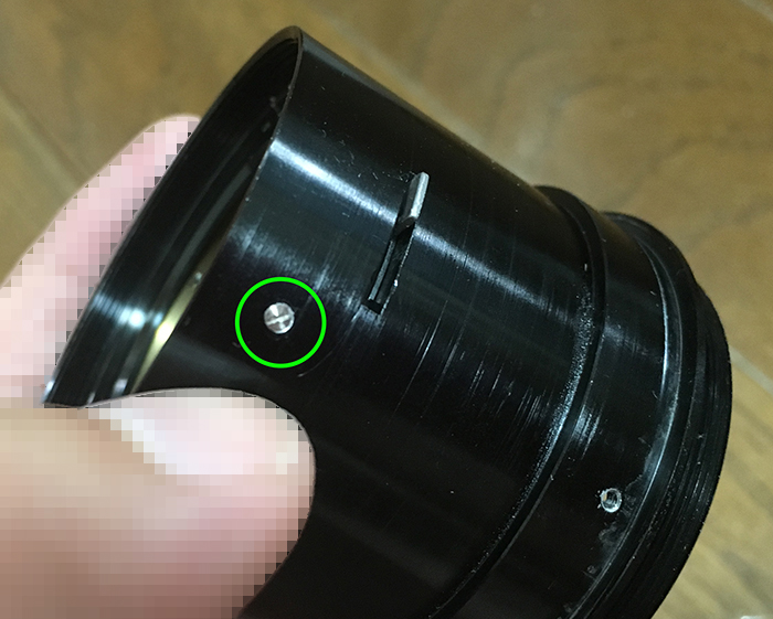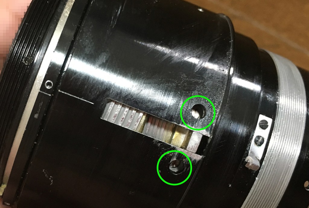 Once the sleeve is gone, locate these screws and carefully remove them. The helicoid key is secured by these screws. The helicoid key constrains the turn rate of the helicoids so they all turn at the same rate when the central one is turned, collapsing or extending the whole barrel.
