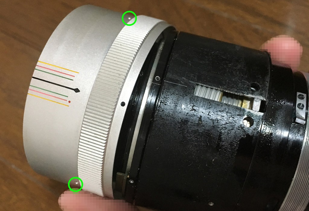 With the hood gone, you can now strip the lens further. Remove the screws (circled) from the focusing ring and just pull it off the lens. It can be hard to remove since solidified grease can bind it or it may be sealed, too.