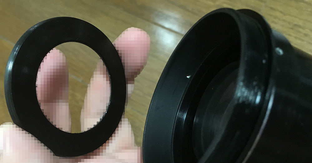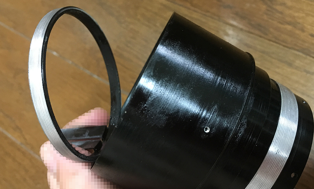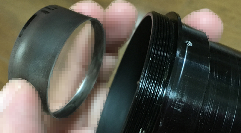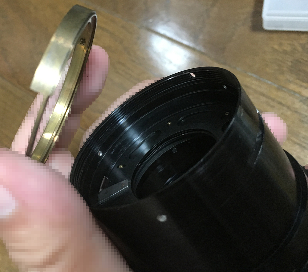 Using a rubber sheet or gloves, unscrew the front ring but be careful not to damage the front element while doing so. It can be hard because this might have been sealed. Drop some solvent into the screw holes of the set screws and let that soften the seals for you. With this ring gone you can remove the hood but don’t do it just yet until you see the next picture.