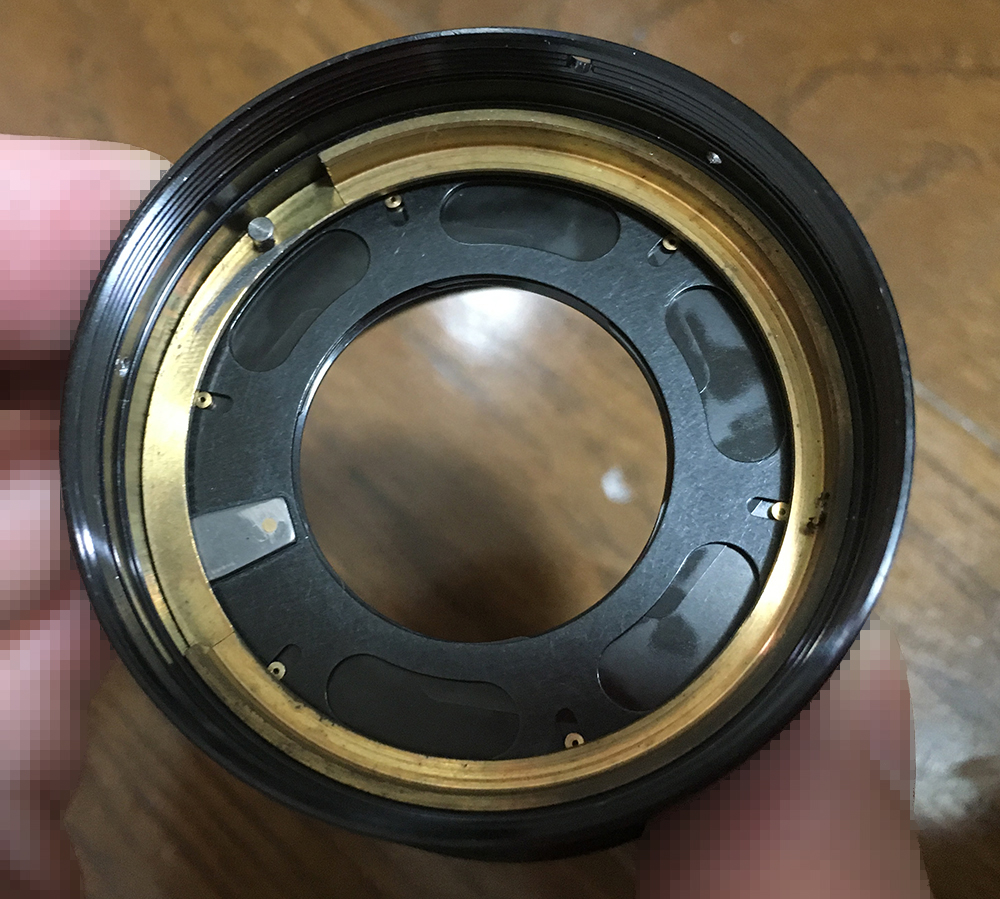 Once the iris blades are gone, you can also remove this ring from the inside of the casing. It’s used as an abutment for the 3rd element and for shielding the holes for the iris blades.