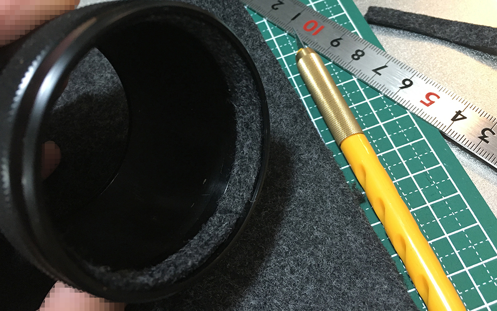 The felt on the lens hood had to be replaced as well. Felt paper was ordered from Amazon because the local Japanese supplier went belly-up. The lining had to be replaced so I looked for a 1mm sheet of felt from my supplies. The right thickness has to be used so the hood won’t be too snug or too loose. Go to your local milliner and ask for scraps.