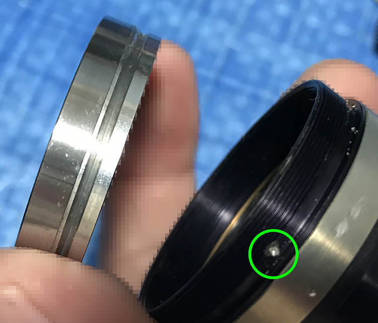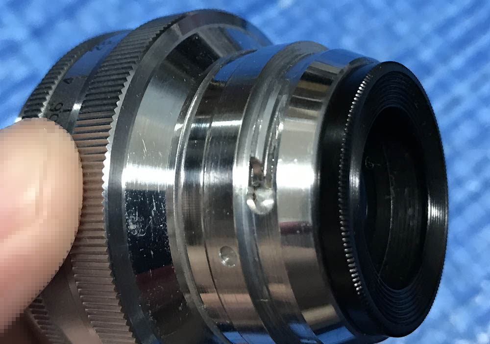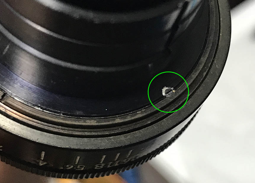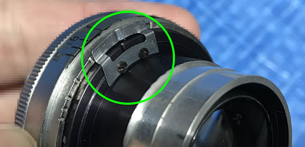 Carefully extract this to remove the front ring. Notice that it has been filed at the factory since this part should be flush or it will impede the movement of the aperture ring.