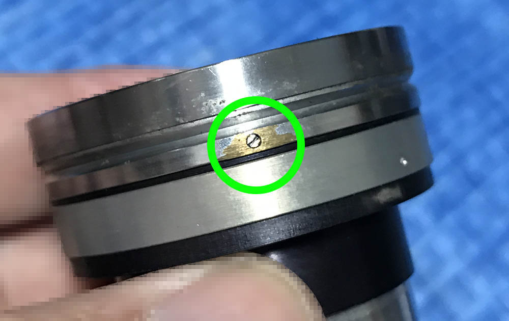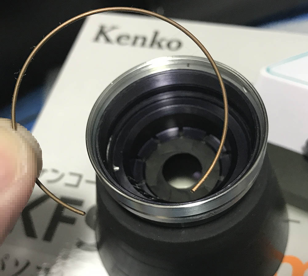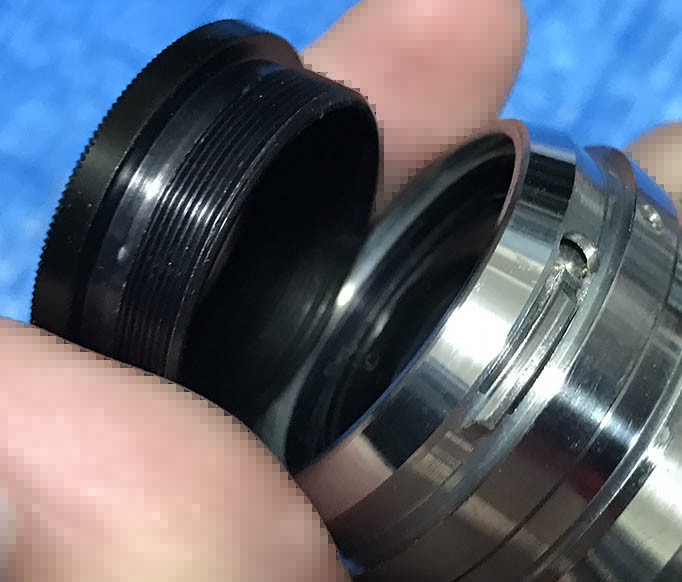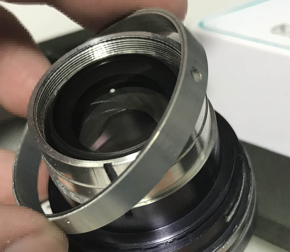 Remove this brass ring to take the iris mechanism apart. Be careful not to damage the exposed iris.