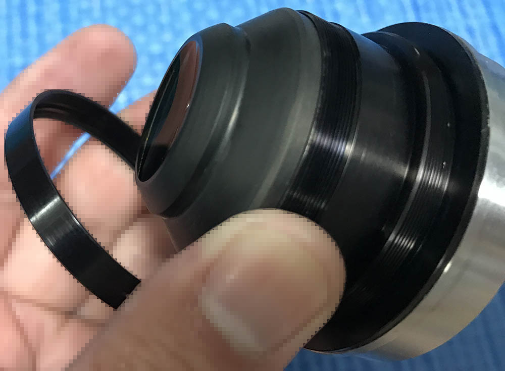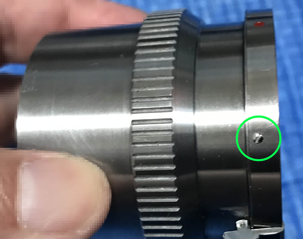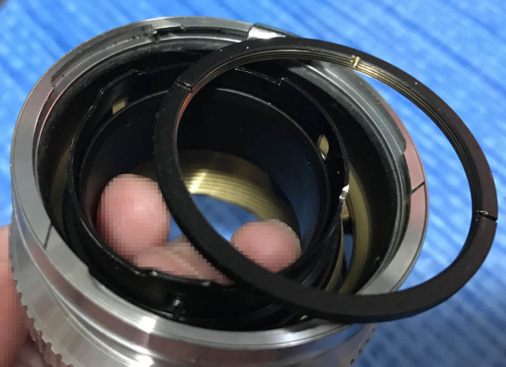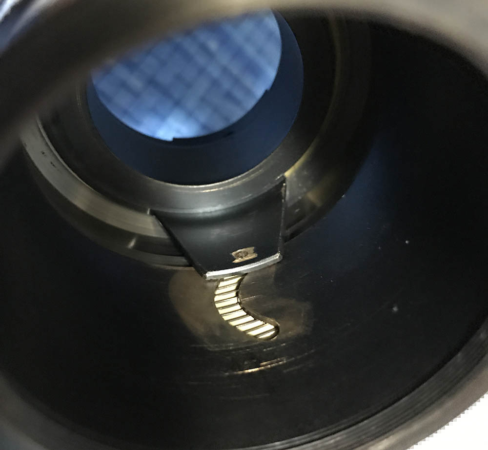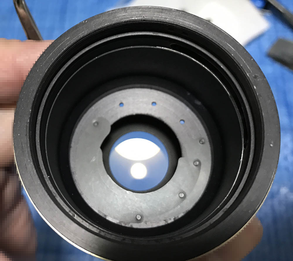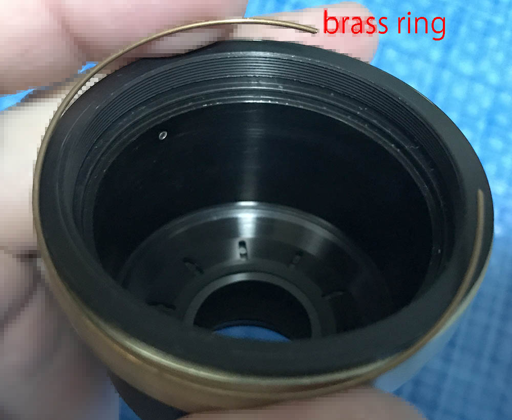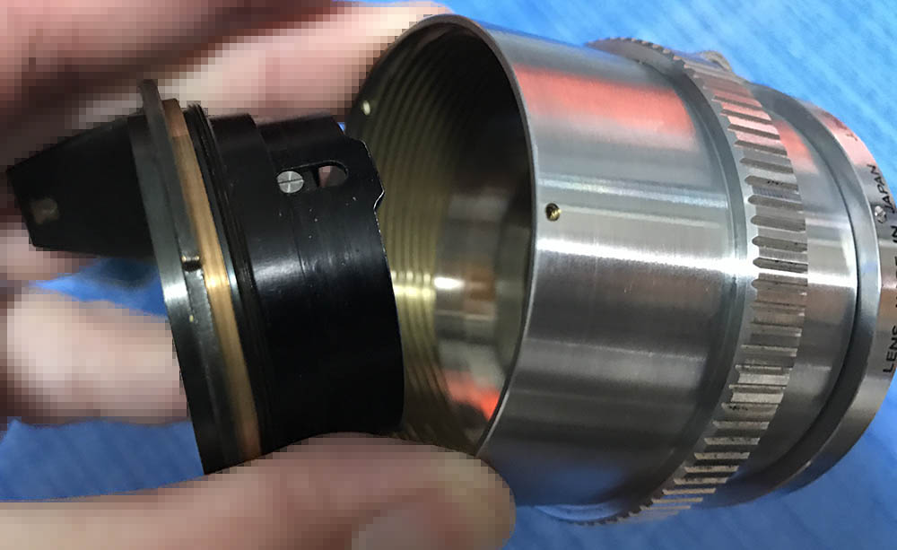 Be careful not to damage or lose the brass shim. It’s used to help adjust its focus. These are unique to each lens and were selected from a box of spares by the person who’s in-charge of calibrating its focus.