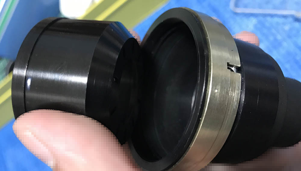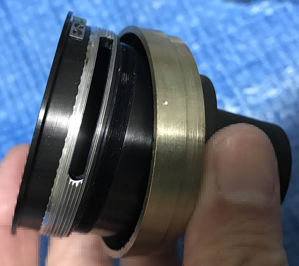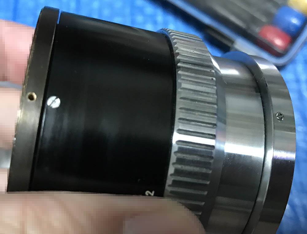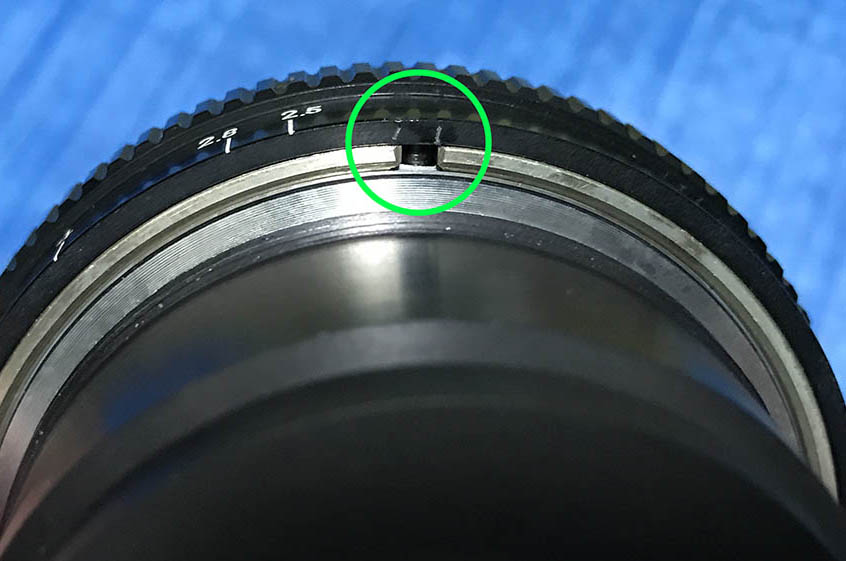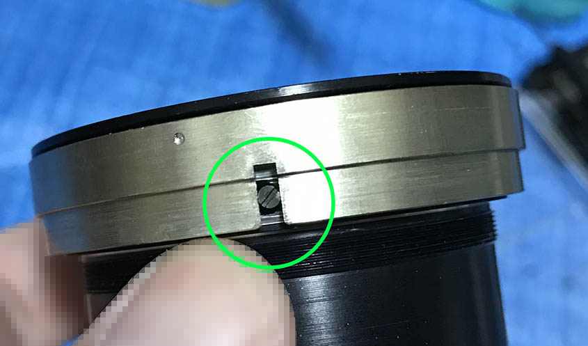 The aperture ring is being held by 3 small set screws. See the dimple on the collar in the picture? That’s where the screws sink into. You have to put this ring back together again the same way as how it was so the mark we made in the previous step will help a lot.