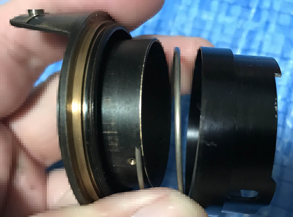 Take notes before you dismantle this. This shows the focusing cam’s inner mechanism, the screw slides within the slot as you turn the focusing ring. The cam on the other side pushes a lever in the camera that operates the rangefinder.