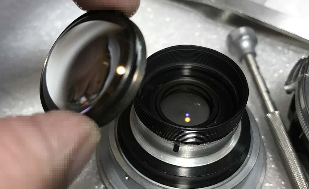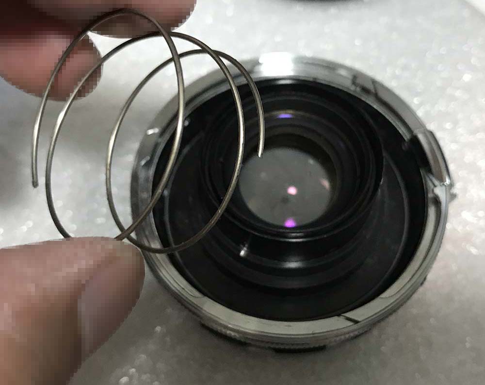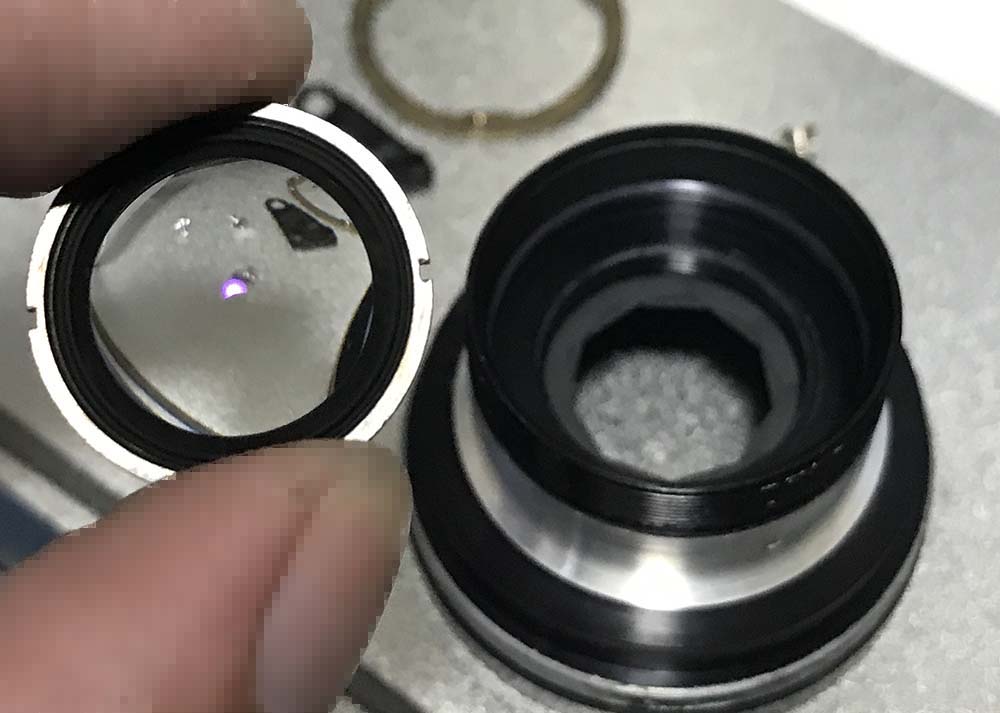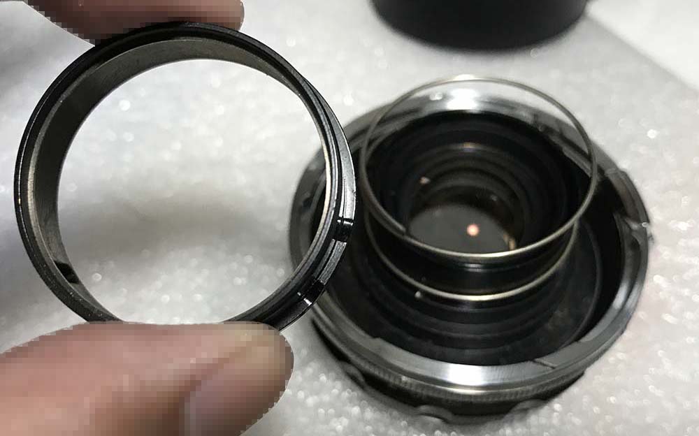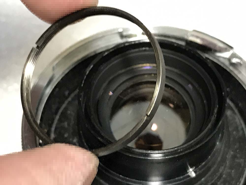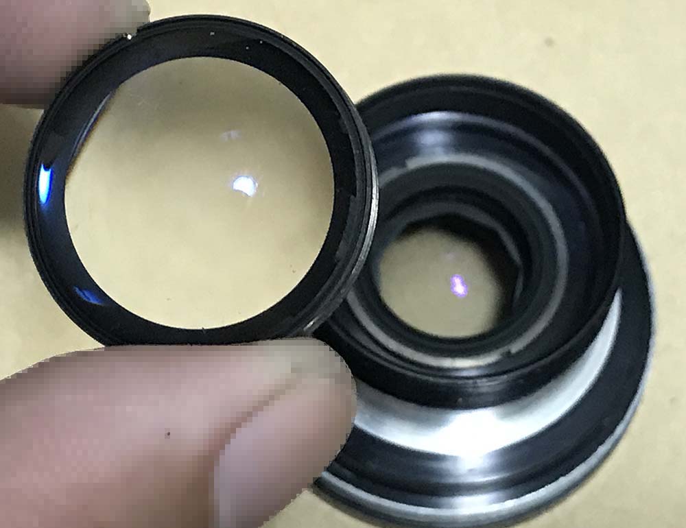 This doublet is secured with a retainer. Extract this retainer with a pipe-key so you won’t scratch the glass, a lens spanner may be too-big for this job.