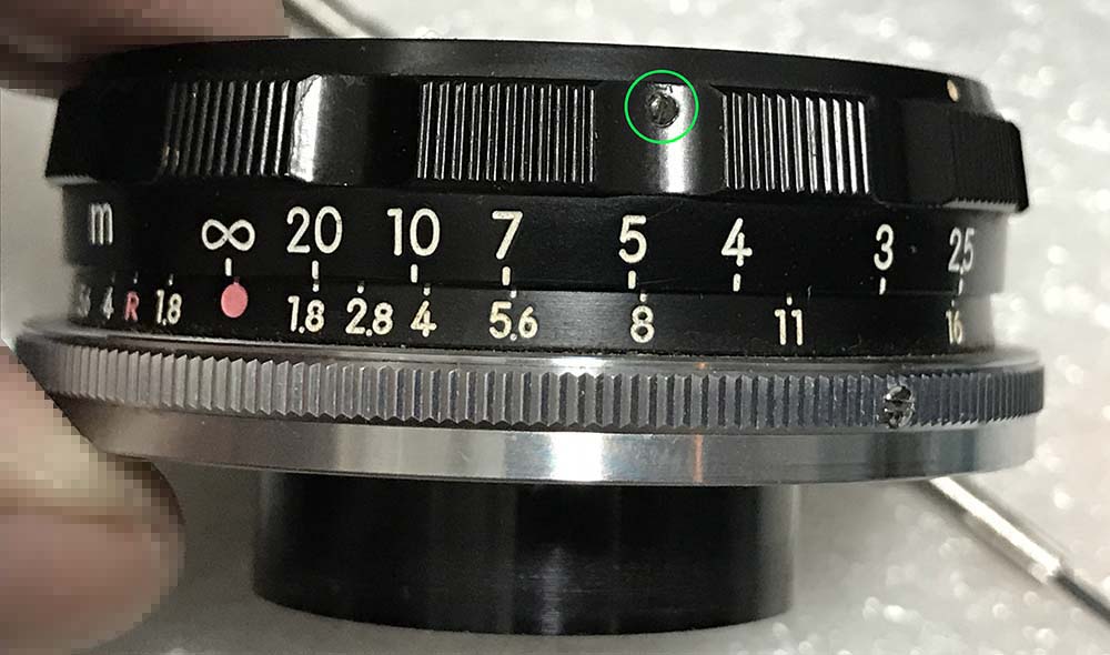 The mark corresponds to the infinity mark in the focusing scale. I should be able to reproduce this later. Don’t bother removing the screw underneath it since you’ll be able to dismantle the barrel without extracting it. It serves as a helicoid stop so you won’t be able to turn this beyond its range.