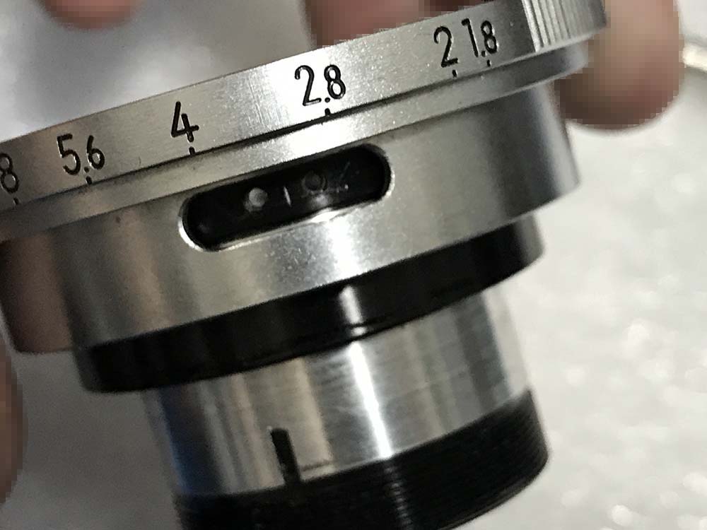 Extract this to remove the aperture ring but note its position before you do it. There’s a similar hole at the other side and it could confuse you later. The screw couples the aperture ring to the iris mechanism, it’s a delicate pin so it’s easy to damage. Handle it with care.