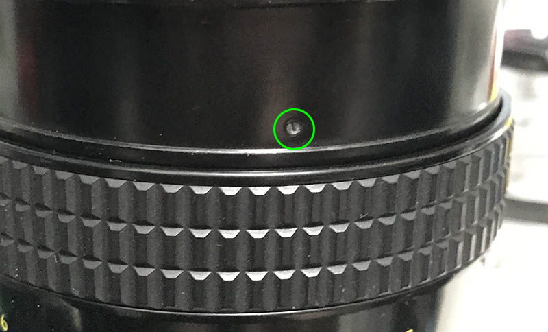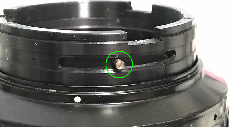Before you can remove the sleeve you will have to extract this screw. This is in the way so it has to go. This screw couples the aperture ring to the iris, it can be damaged easily so make sure that you remove this carefully.