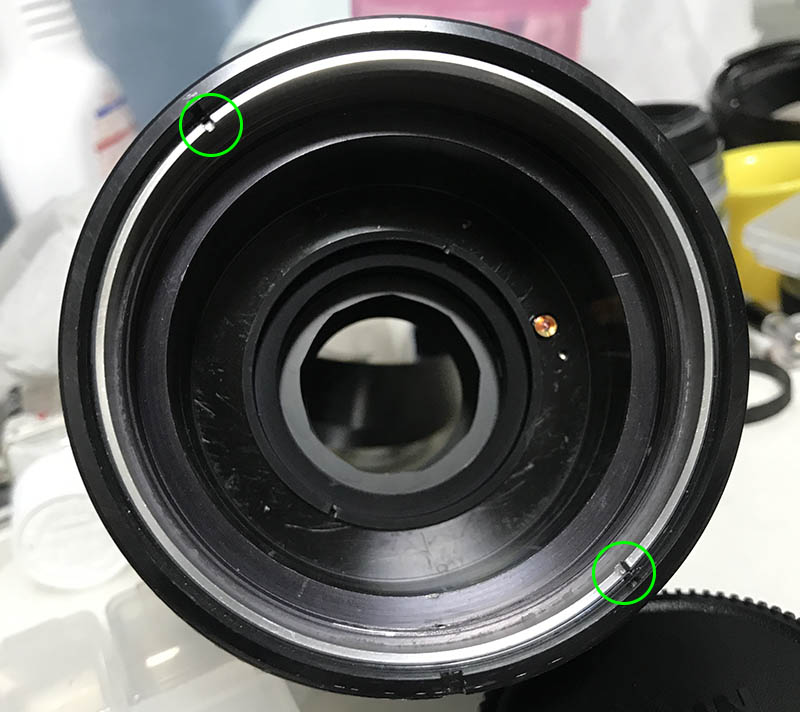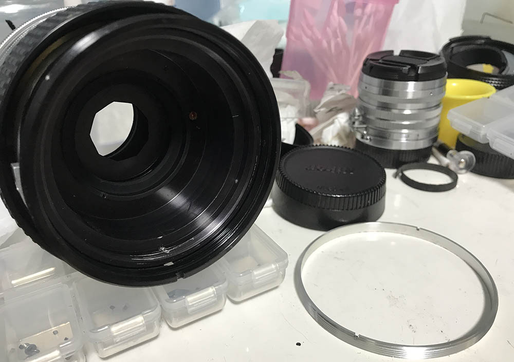 The rear element is easy to clean through the iris, just open it and use a lint-free tissue to clean it while being careful not to damage the iris. If you have to clean it thoroughly like in the case of bad fungus damage, you can extract the rear element after removing its collar. Make sure that you return all the elements facing in the correct direction. I sometimes write a small dot using a permanent marker to help me determine which side should face where.