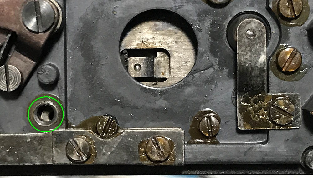 This is the perfect time to take notes and study how things work. This is the spring of the slow-speed lever and its pawl. The spring ensures that this will always be depressed against the slow-speed regulator. Look closely and you will notice that the pawl is resting against a flat post. This is the position for the T setting. Turning the slow-speed selector dial will dislodge this so it will continue to turn and activate the closing curtain. Encircled in this picture is the adjuster for the slow-speeds, this is an eccentric and it adjusts how deep the slow-speed lever should go. This is where you adjust speeds from 1/2s to T but it will also affect 1/4s somewhat. The small screw to the left of the end of the spring where it rests is another eccentric and turning this will allow you to adjust speeds from 1/8s to 1/30s. These all affect each other to a small extent and they are somewhat dependent on each other so adjusting one of them will affect the other one’s results in small ways.