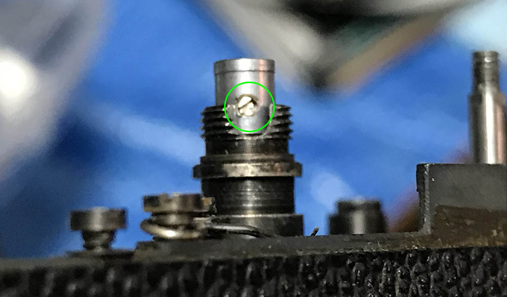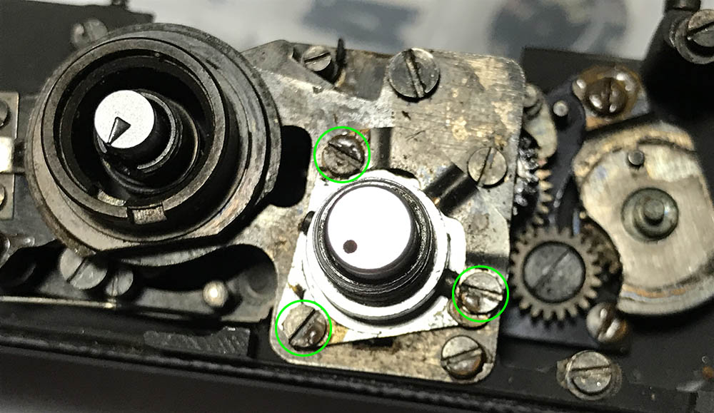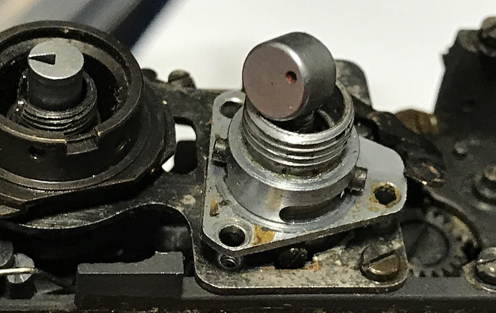 This is optional but I sometimes remove the spinning tip of the shutter’s rod to clean the cover and flush everything with solvents. Extract this screw to remove the cover and make sure to put it back properly, it should sink into a small depression on the rod or else the cover won’t be centered to the rod. This will cause it to touch the inner walls of the high-speed selector dial as it spins and that causes erratic fast shutter speeds which can be frustrating to trace.