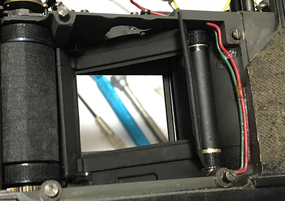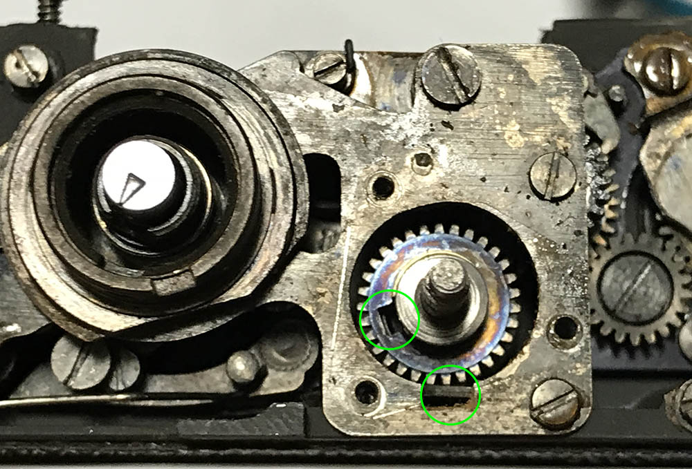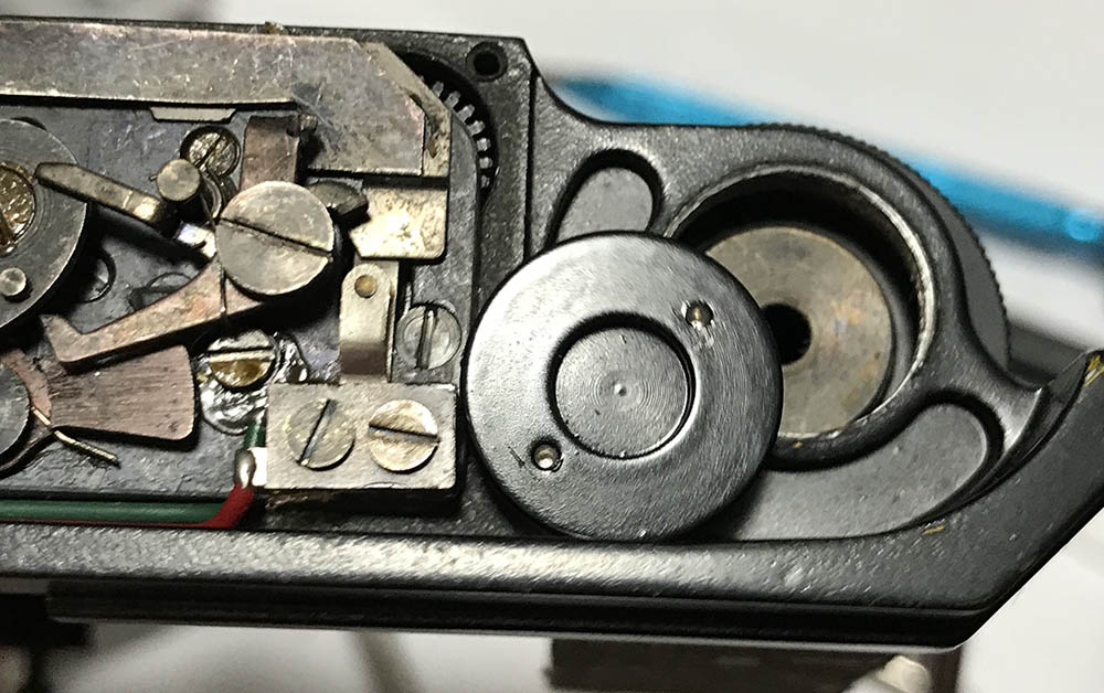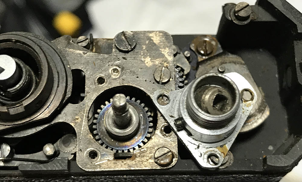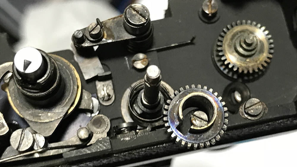 Remove the spindle of the film counter to reveal the eccentric underneath it and the cogs that turn it. These can get really dirty so clean them carefully.