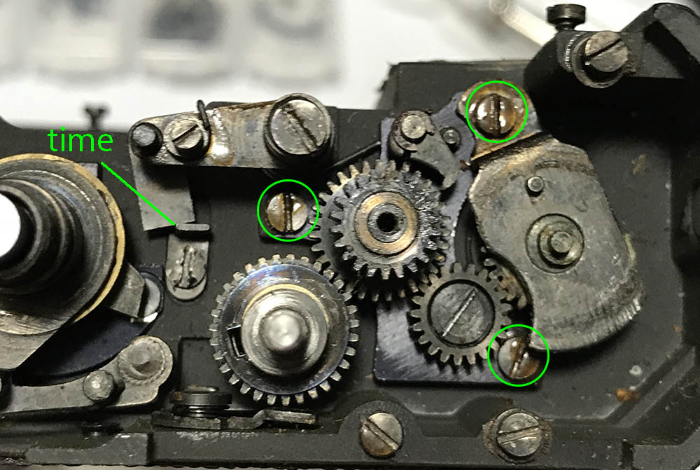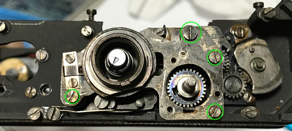 Time to go back to removing things. Unscrew these to remove the gear train of the advance and film counter mechanisms. It’s an assembly and it can be removed as a single unit. This is also adjustable just like the A/R mechanism so note its position. If this isn’t positioned properly your advance lever will not turn smoothly or the film counter won’t turn evenly. It’s also easy to see the position of the slow-speed lever in this picture, it’s set to T (time) here. If your shutter won’t stay open when set to T then you should adjust the post. I rarely have the need to do this.