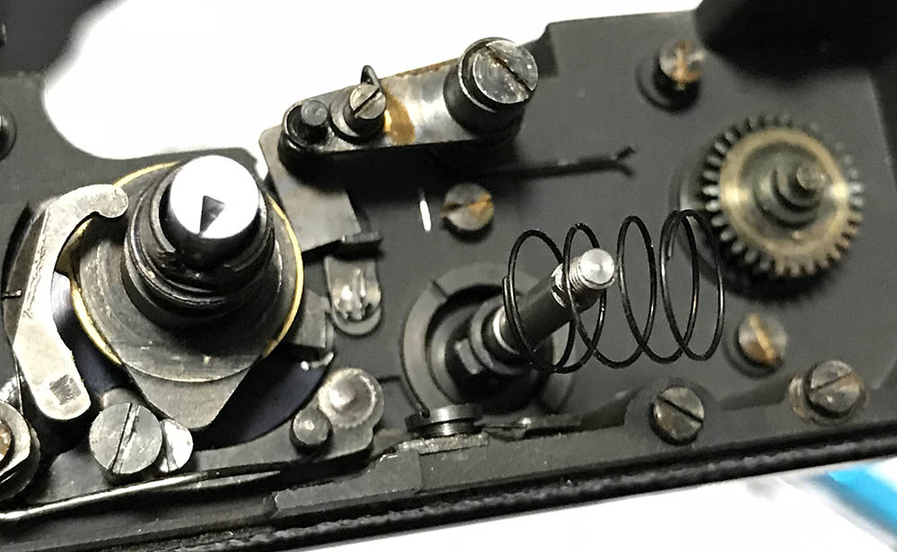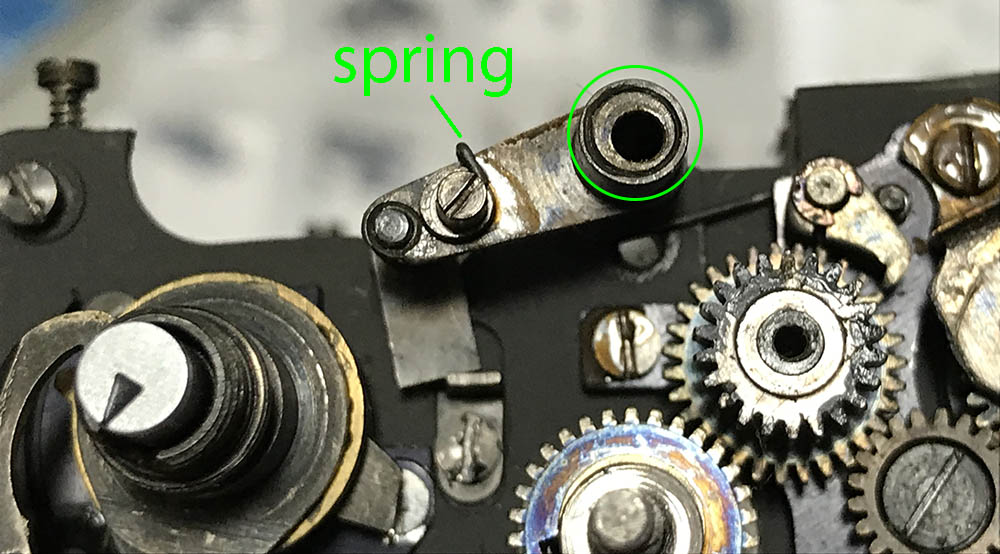 Don’t lose this spring under the coupling gear or it won’t work properly. The spring ensures that it will rise when the A/R switch is turned to R. This also suspends the coupling gear in-place so losing it will result in a shutter that’s never going to cock properly or allow it to rewind.