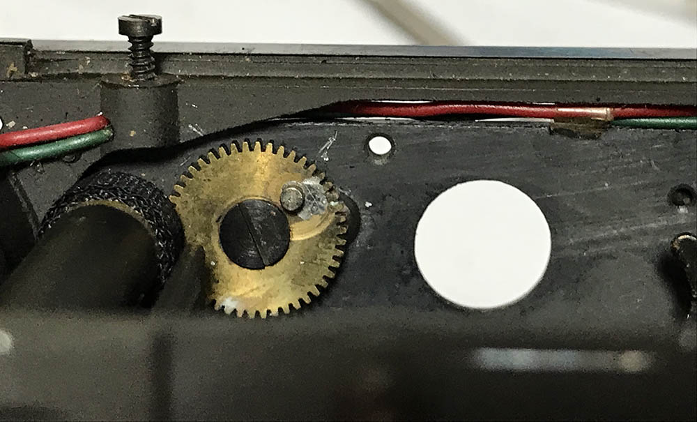 Here’s a closer view of the gear train for the film counter mechanism. These are usually greased at the factory and that grease can get caked and end up making this mechanism feel rough. Note the position of everything, take all the pictures you need for your notes before you remove anything. The cogs for the eccentric pin can be easily removed.