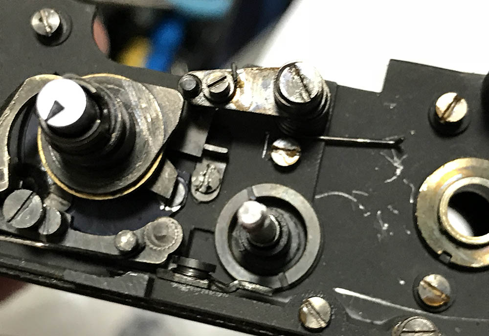 Take plenty of notes before you dismantle the A/R switch mechanism. It can be difficult to put this back properly if you don’t know how it should align. I sometimes make a small mark to help me determine the cam’s position. The screws here aren’t identical, too.