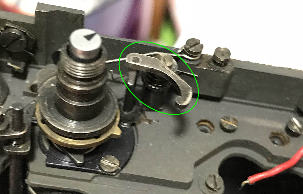 Carefully remove the retarder and make sure that it doesn’t catch anything. You may have to press on the change-over lever to free this. One important thing that I should note is you have to be careful when removing this since the coupling fork of the slow-speed shaft is connected to this, you can see it in this picture just below the drum of the closing curtain.