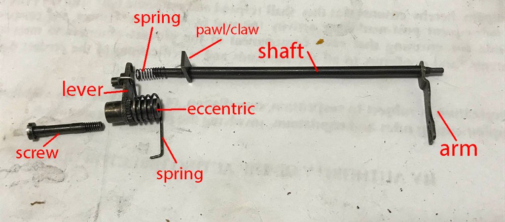 There is a hook on the end of a spring in one of the cogs, this pulls the pawl when it’s turned the other way. This way, the advance lever won’t and all of the cogs won’t re-set before the shutter is cocked and will allow you to cock the shutter in increments. This spring can easily be lost so be careful. Do not lose anything here and take plenty of notes on how things should be aligned or where each and every part is positioned, that includes the washers.