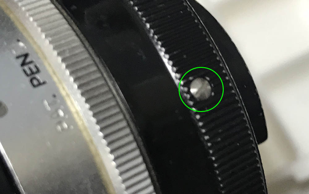 Removing the aperture ring involves extracting this screw. It serves as a pin to couple the aperture ring to its fork underneath it. This enables it to adjust the iris mechanism deep-inside the lens barrel.