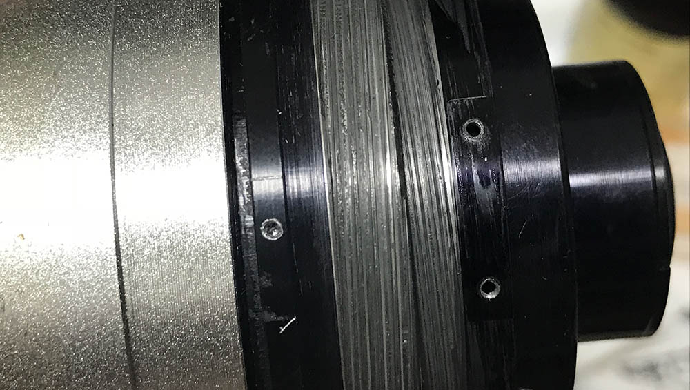 This is a good time to take notes on how the helicoids should be aligned. It’s important to take the notes while the barrel is set to infinity, this will help you later because you’ll have a point-of-reference. You can remove the screws of the helicoid key through these ports. The helicoid key constrains the movement of the helicoids so turning the central one will enable you to turn the inner one, extending or collapsing the barrel.