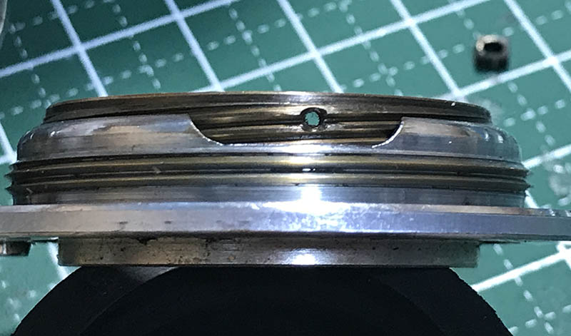 To separate the helicoids you must first remove its key but before doing that make sure that you turn the barrel to infinity and work on it at that state. It will make things a lot easier for you as you will have a point of reference. If you take your photos and references without doing this then it’s going to be hard for you to determine the proper alignment of things. The helicoid key can be removed by extracting a screw at the opposite end of this hole.