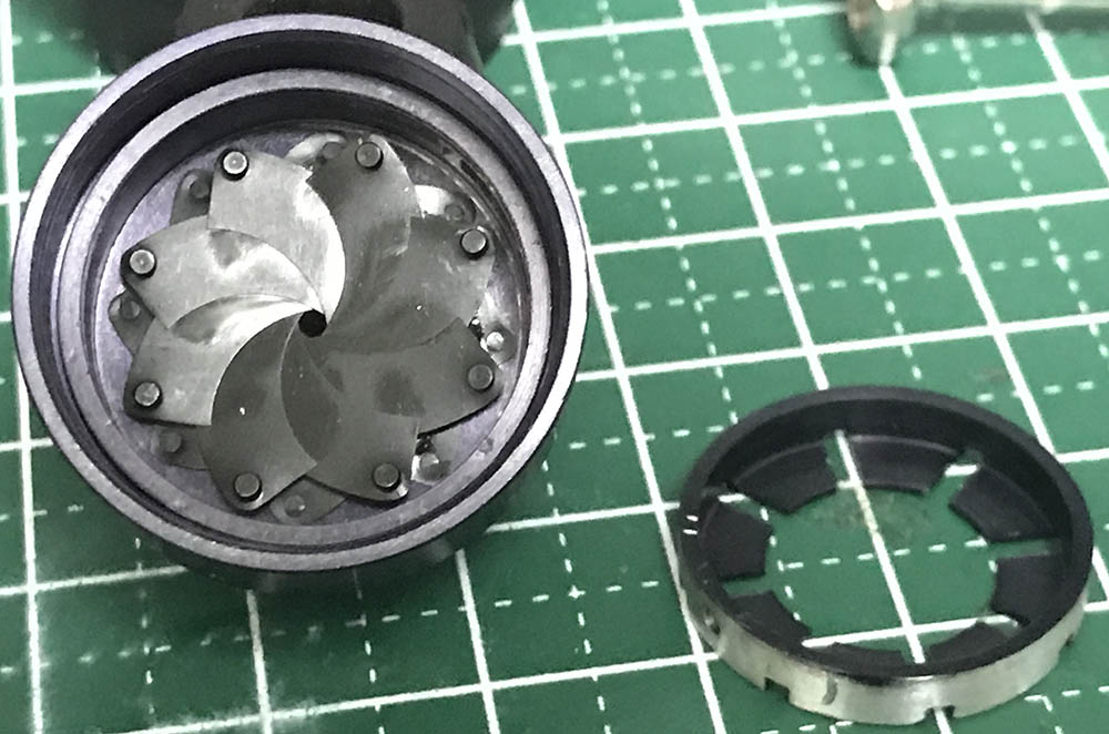 Use a sharp pair of tweezers to poke at the rear of the iris to lift the pins off from their holes. Do it carefully so you won’t damage the iris. The iris came off in one piece due to the oil coating it.