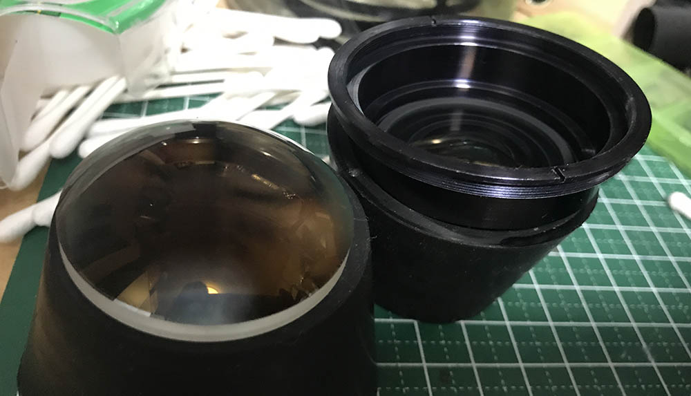 The rear elements assembly can be easily removed after extracting all of its screws. Putting it back in the right way is essential so take plenty of notes so you won’t get lost. Notice that there’s a build-up of evaporated oil that forms a haze on the surface of the elements. Grease can gas and the result is this.