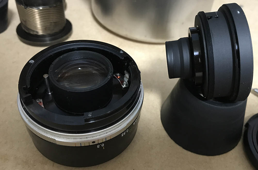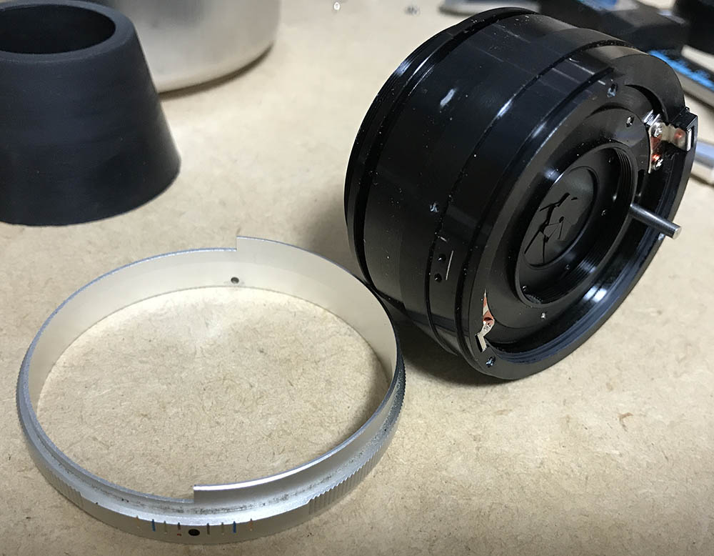 Study how the aperture regulator ring and its mechanisms work and how a rod in the iris mechanism couples to the stop-down mechanism’s fork work. It connects to the fork in the bayonet.