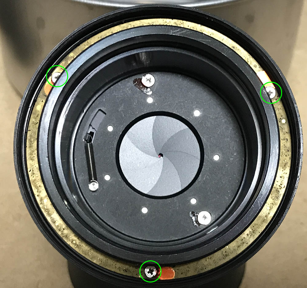 The iris mechanism can be removed after you extract these screws. This is a fine adjustment point so make sure to mark its alignment before the screws are removed. You will have to put this back the same way later.