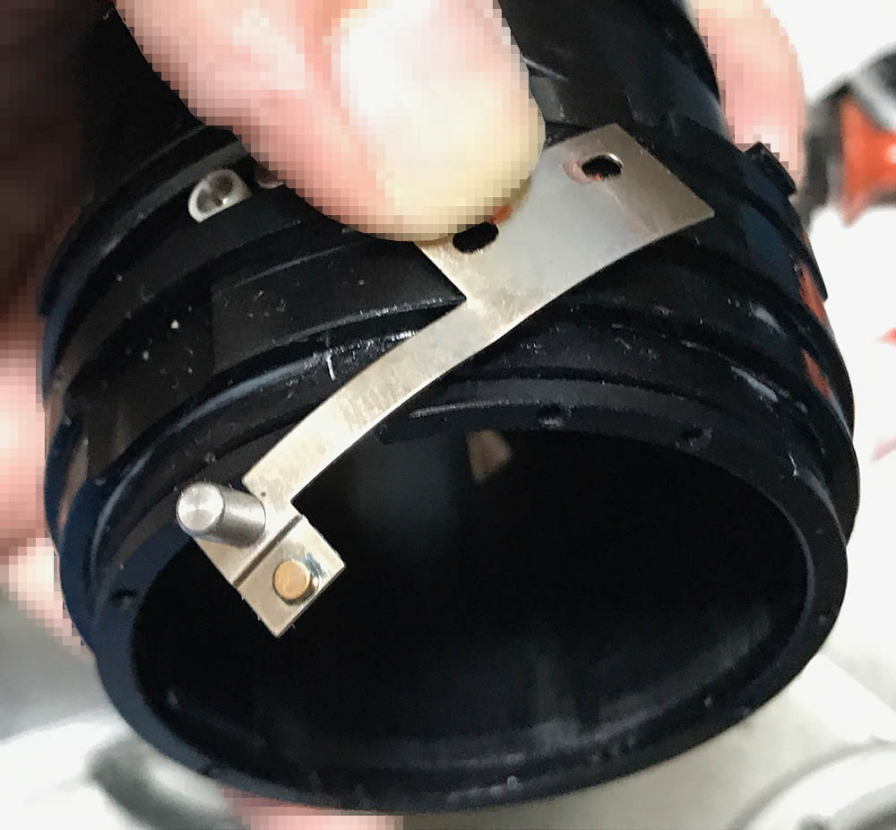 This is how the spring looks like, it’s basically a cantilever spring with a tab that locks the ring into place at either end of the macro cam’s range. If you look at the photo you will notice that one’s longer, that’s the button.