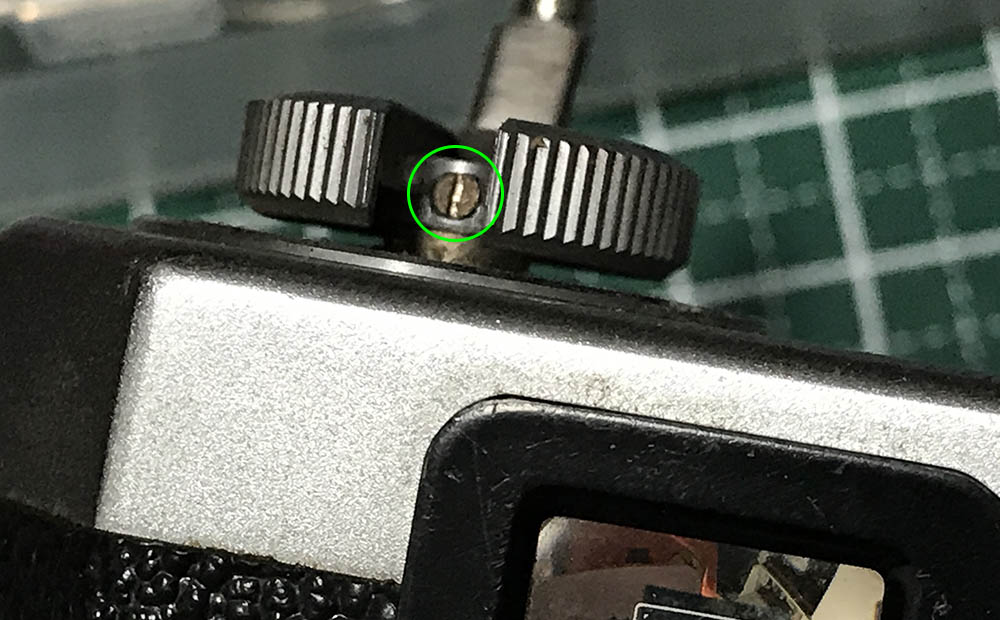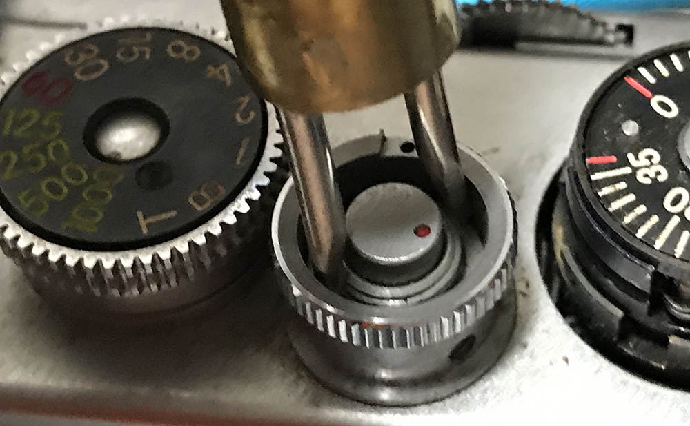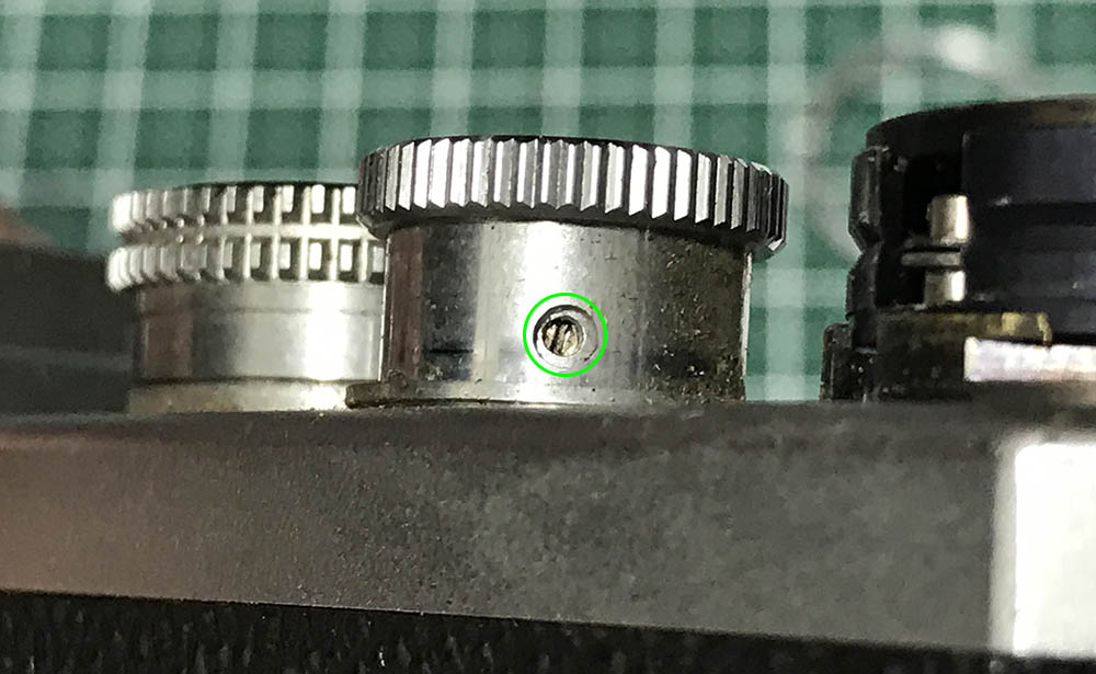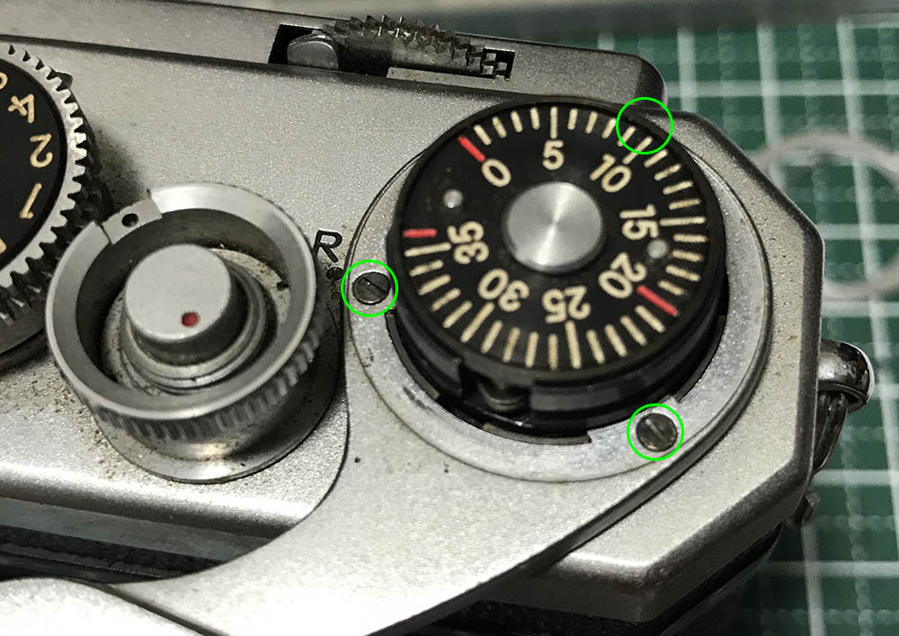 You begin by removing the housing of the film counter. It’s being secured by these set screws. Loosen these but don’t extract them, they can be misplaced easily.