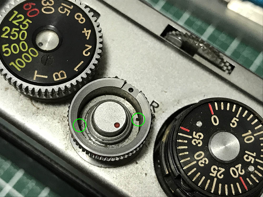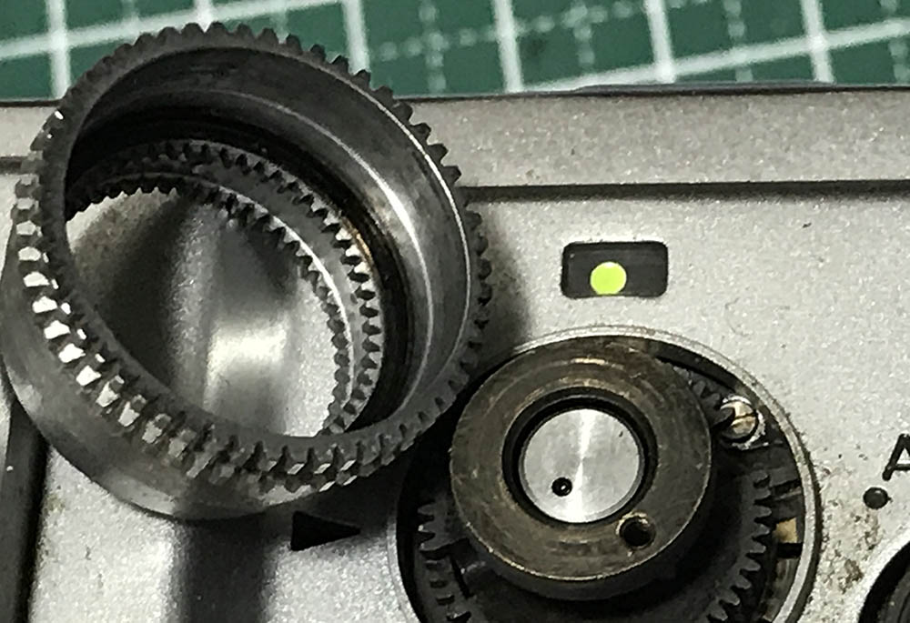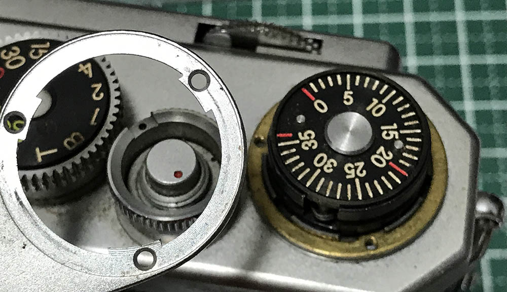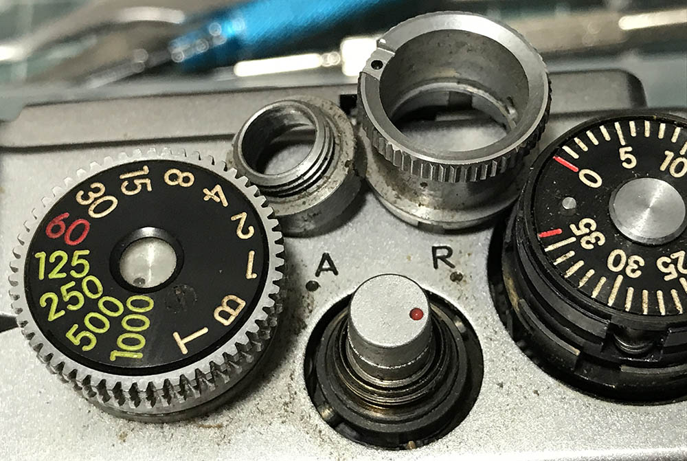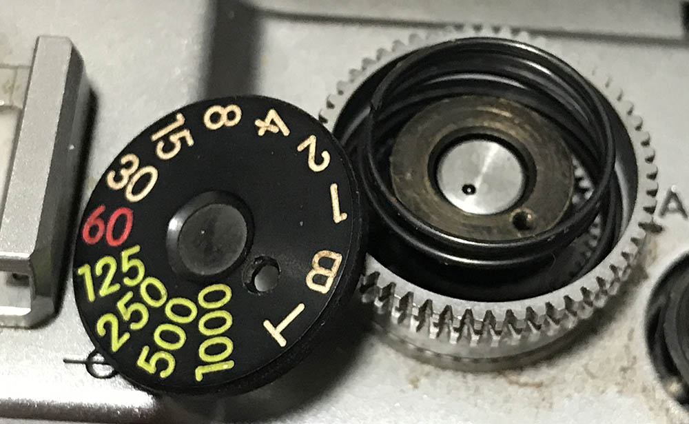 The shutter speed selector knob can now be removed. Notice that the collar is still inside the knob, grime can make it stick to the knob.