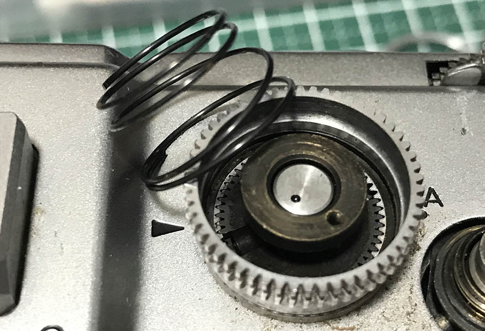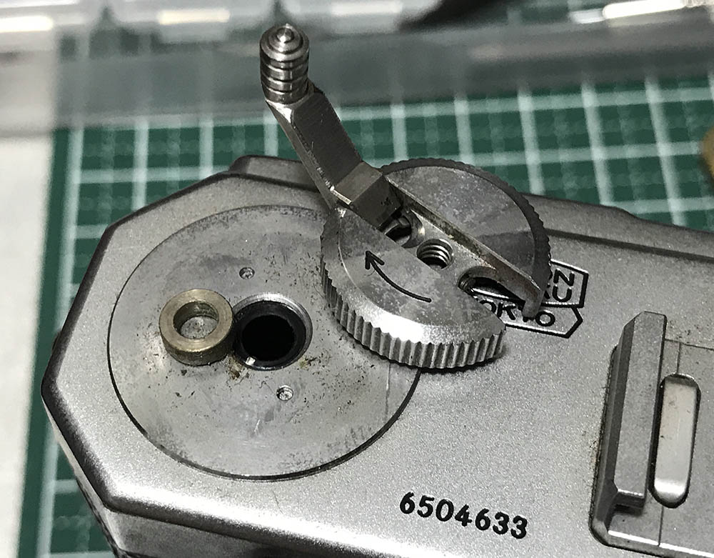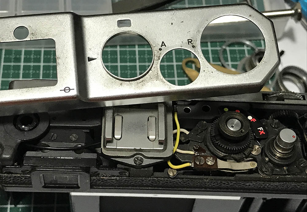 Once you remove the A/R ring assembly you’ll see how this controls the film advance/rewind action. The A/R ring couples to these 2 screws underneath the top panel.