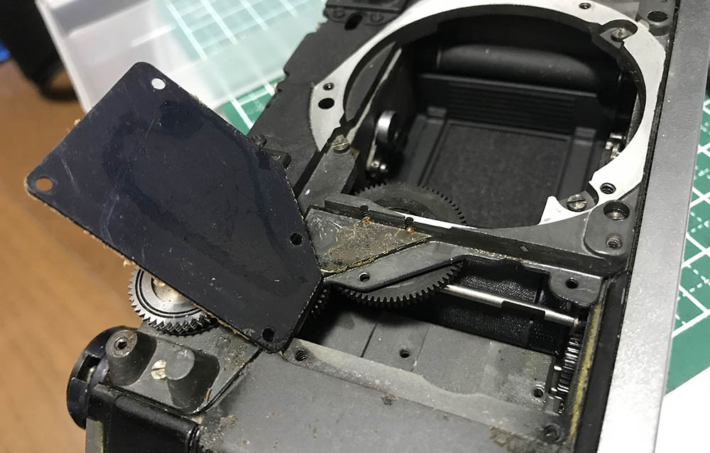 Carefully clean the helicoids and lap the threads if you have to. Clean all of the gears carefully with a brush or dunk them in solvents overnight. Make sure to remove all of the dirt and solidified gunk here. The front panel has plenty of contact cement residue, the only way to remove them is to soak it in an alcohol bath.