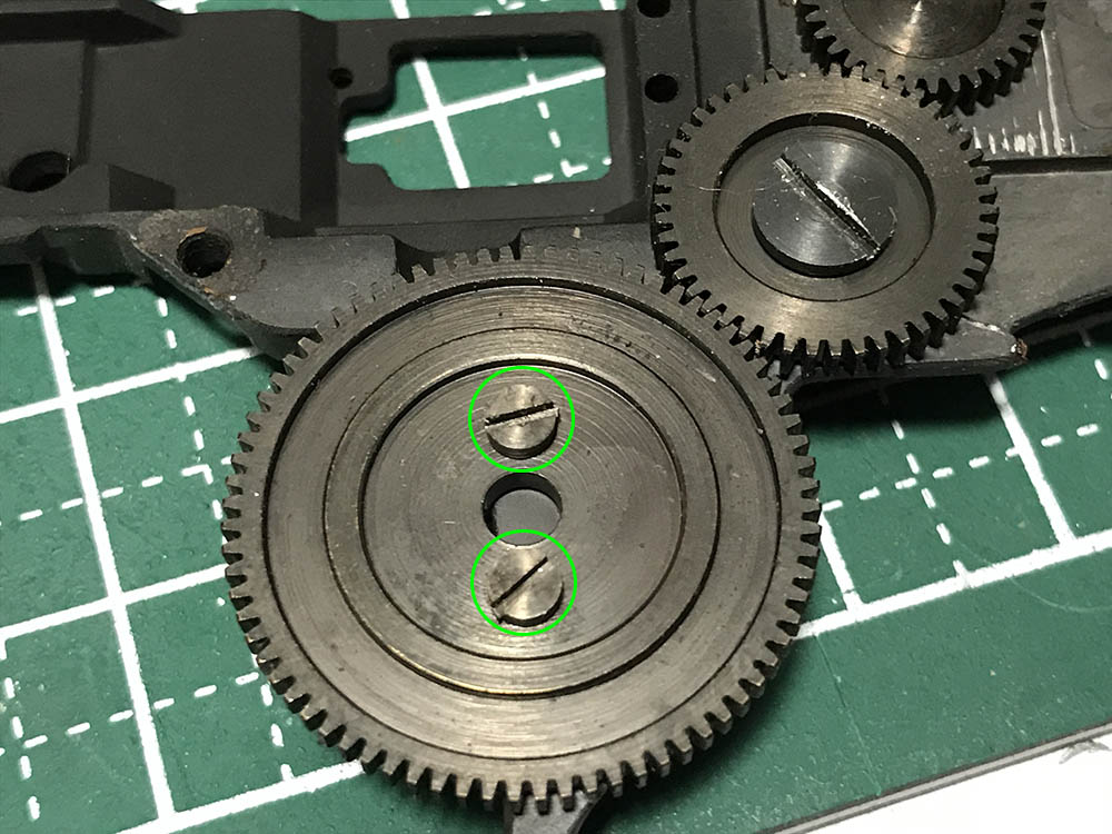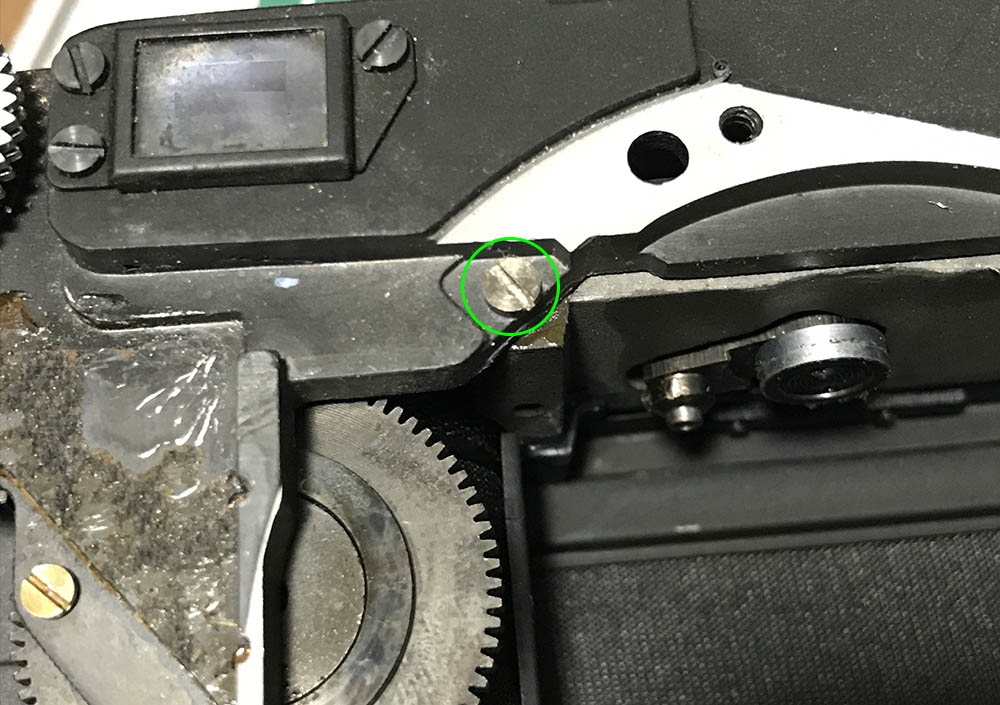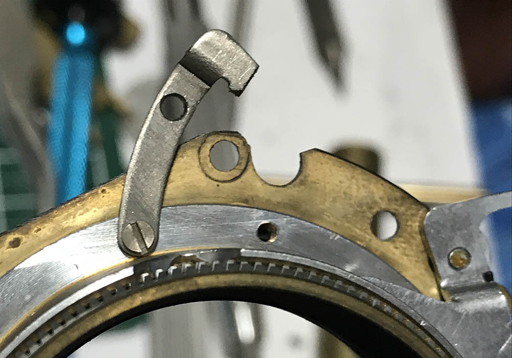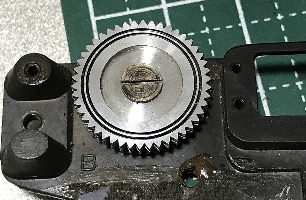 The focusing wheel’s largest gear is secured by these screws. All the screws in this gear train were sealed and you should heat them with a torch just to soften their seals. Not doing this will make it risky to remove these, you can strip the slots easily since these are brass screws.