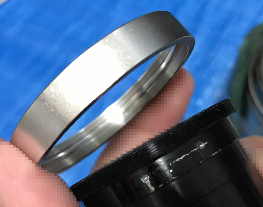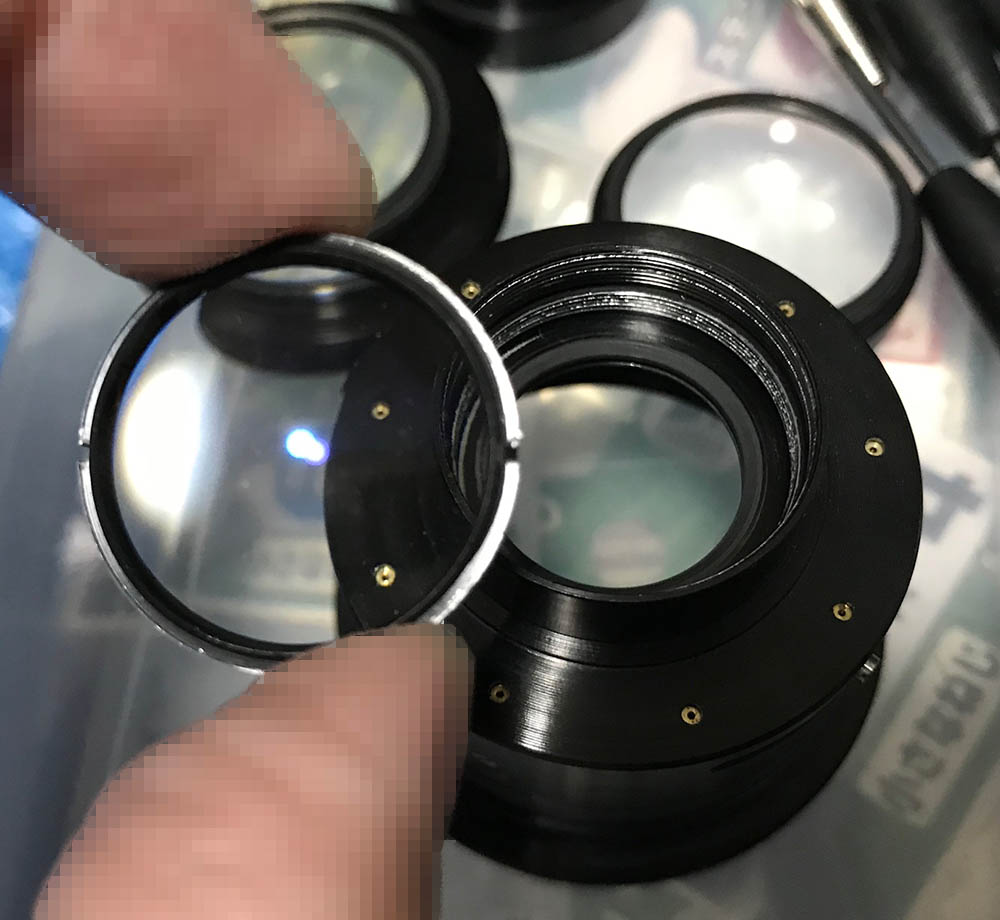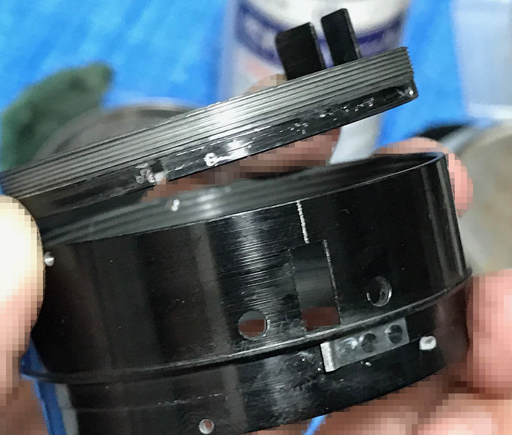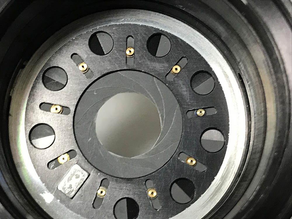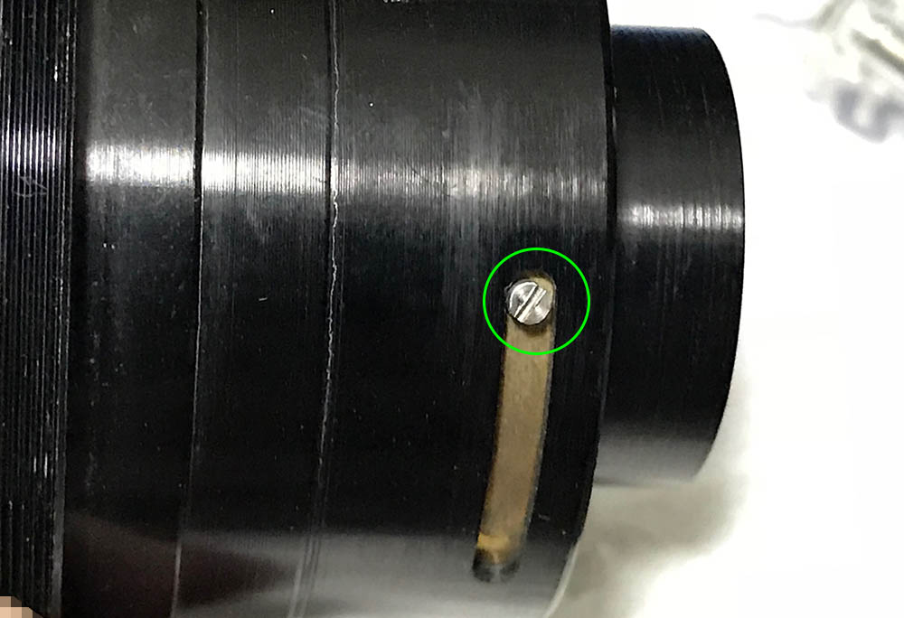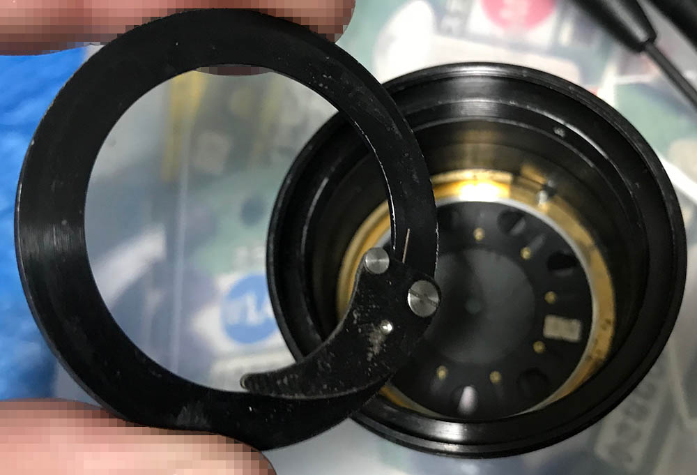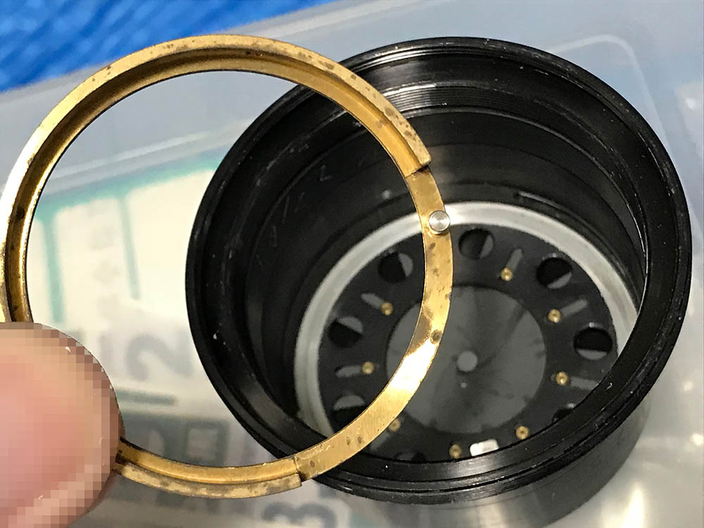 Extract this to remove the brass ring, this couples to the aperture ring’s fork so you can control the iris when you turn the aperture ring.