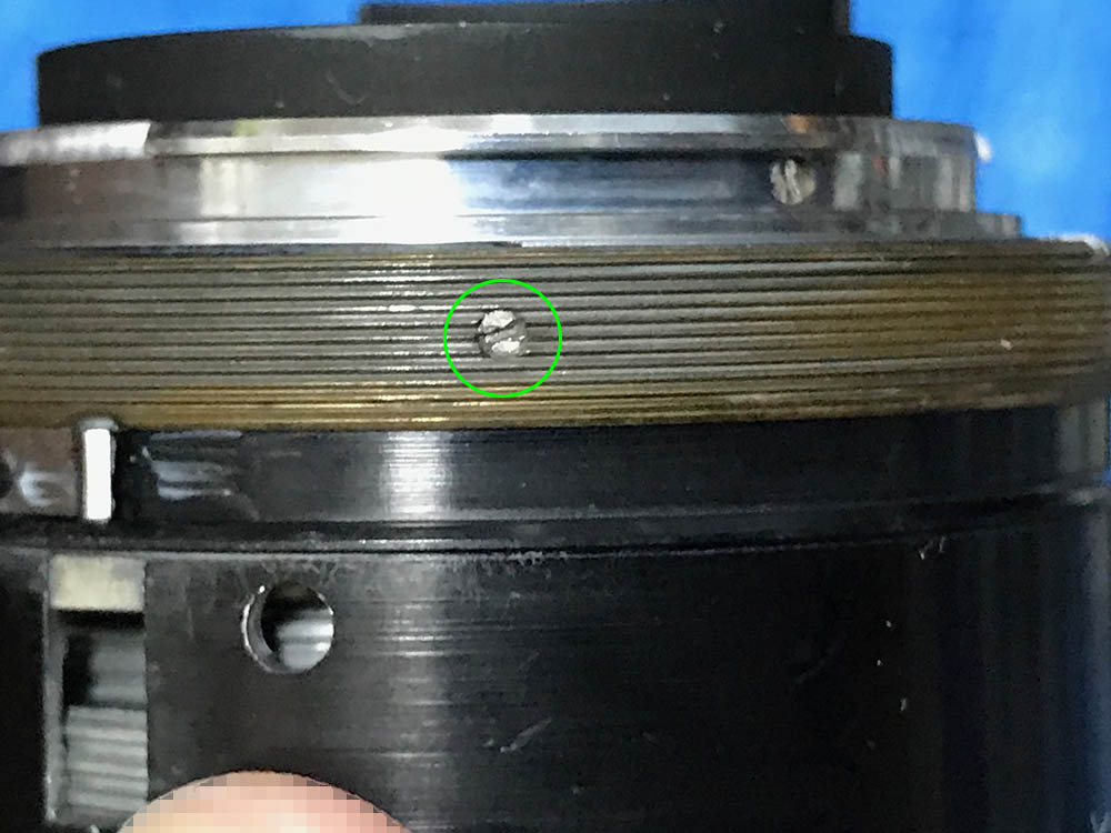 Before you remove the aperture ring extract this screw first. This screw acts like a pin to couple the aperture ring to the iris mechanism.