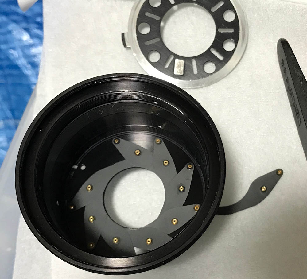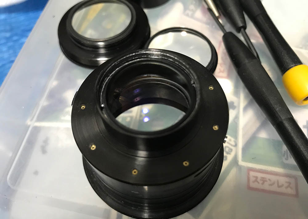 I cleaned the iris mechanism thoroughly, wiped the blades with lens tissue saturated with naphtha and put them back one-by-one. It’s more difficult to put these back because they are small, it’s easy to dislodge one if you’re not careful and you’ll have to re-do everything again.