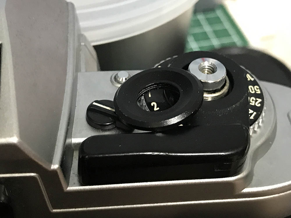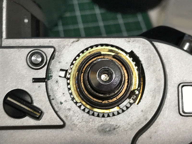 There is a collar that secures the speed-selector dial and the right-hand part of the top panel. Carefully remove it with a lens spanner.
