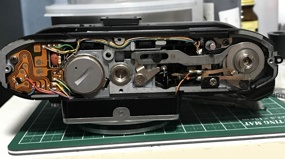The bottom cover can be easily removed once its screws are gone. Clean the moving parts here and oil the pivots, the levers and gears should be greased lightly to help things glide smoothly. Troubles with the mirror-box, advance mechanism and charging can sometimes be fixed from here depending on its severity or location. Some levers or pins may be bent or some things may be stuck due to dry grease. The brush over to the right side is used to help it communicate with the motor-drive if a cycle ended. Clean it with Q-tips and be careful not to damage the brush.
