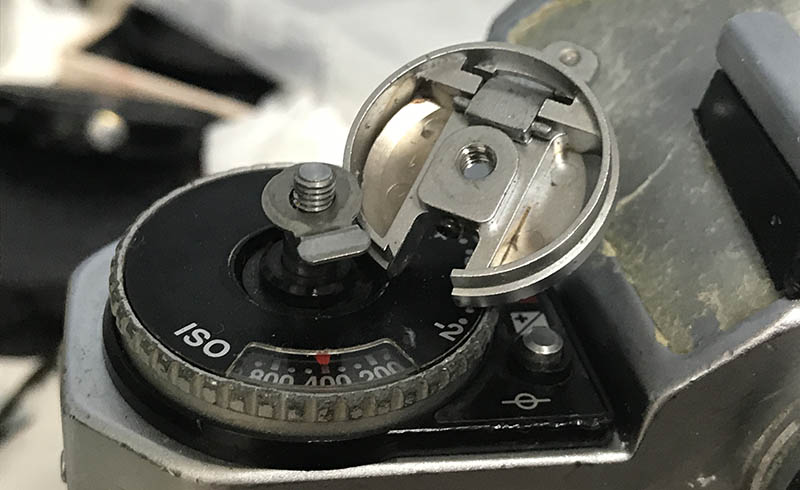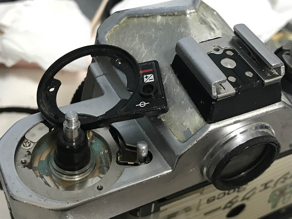 Here’s what’s underneath the top panel. There are plenty of electronics, you can easily damage anything here if you’re not careful and brick the camera. If that happens then you’ll have an all-mechanical camera. Clean whatever you can without disturbing the electronics. The AE-lock contacts should be cleaned, too. Condensation and dirt can make it conduct poorly.