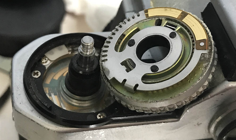 Once that clip is gone you can remove the ISO-selector dial. Be careful not to damage anything here, there are fine contacts in this area. Mine was filthy, you can find crusts around the rim which can can get worse if not cleaned. I think it’s a mixture of dead skin cells, salts from sweat and fungus. Wipe the contacts clean with a Q-tip soaked in alcohol.