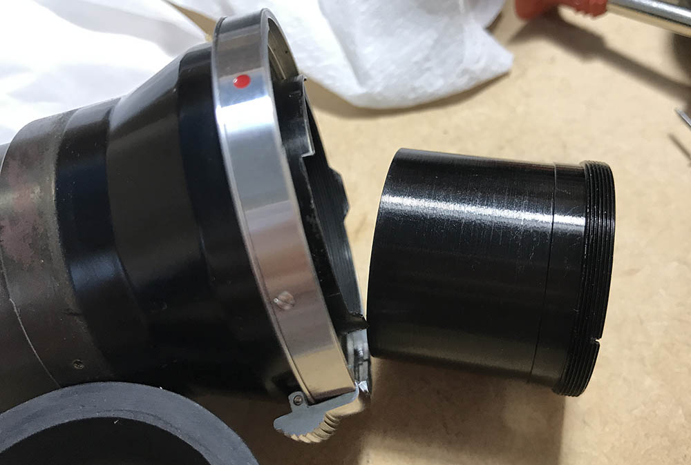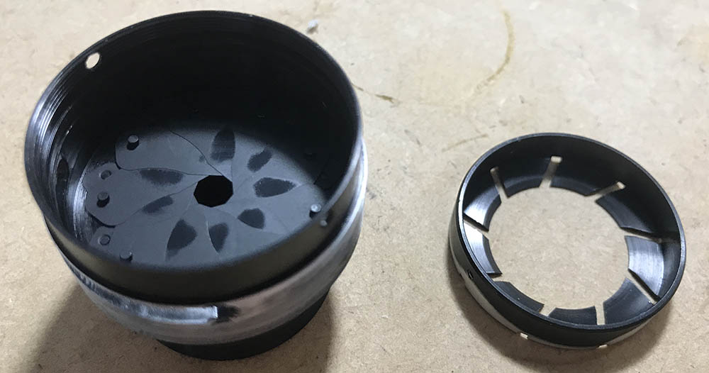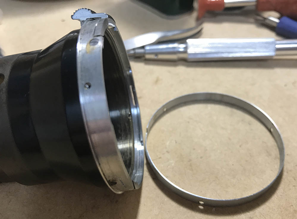 The iris mechanism is being secured by this collar. It’s just a brass ring, you can use a screwdriver to pick this off.