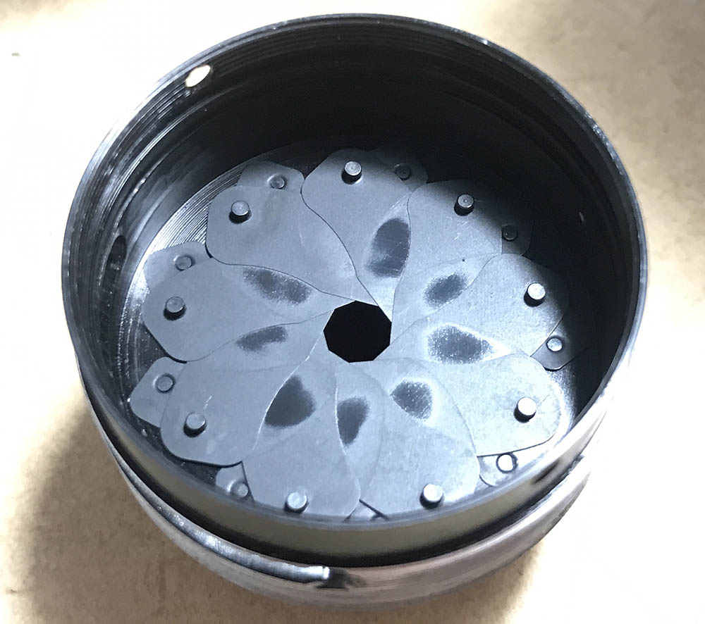 I applied a generous amount of powdered graphite to the iris mechanism, it was then exercised so the powder coats everything evenly. A bulb blower is handy for removing excess powder. Make sure that you remove as much as you can while still leaving a thin, even coat. It shouldn’t be obvious, a shiny patina should be enough.
